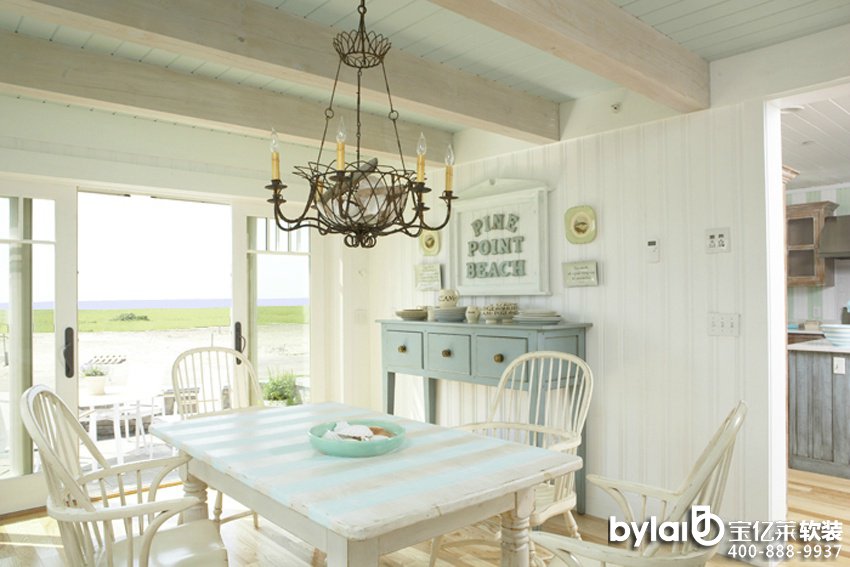 敞開的落地陽臺,陽光調(diào)皮的跳躍在藍白色的條紋相間的桌面和鏤空的白色椅子上,復古的古銅色花式吊燈隨著風輕輕的晃動著,一切都顯得那么愜意和美好。