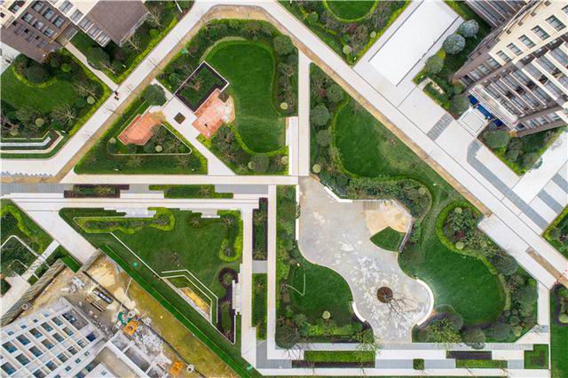 在翡翠公園的陽臺(tái),你看見的景色還可以更多。你還可以像工地開放日來參觀的業(yè)主們一樣,站在自家寬敞的陽臺(tái)上,扶著欄桿,俯忘樓下小區(qū)綠地蟠青叢翠。在這次開放日活動(dòng)中,翡翠公園綠化獲得業(yè)主贊譽(yù)無數(shù)。前文提到的建設(shè)完整是獲贊的原因之一,另外一個(gè),則是匠心設(shè)計(jì)下,環(huán)境與建筑風(fēng)騷各領(lǐng),呈現(xiàn)出極具藝術(shù)性的融契之美。項(xiàng)目以陶淵明筆下《桃花源記》為居住藍(lán)本,布局“一環(huán)兩軸五重境”之景,打造了城市里的心棲之地。其中,即將交付樓棟所在的一地塊綠地率約41.29%,總面積近乎有四個(gè)足球場那么大。站在樓上向中庭園林望去,整體規(guī)劃設(shè)置錯(cuò)落有致,各區(qū)域間三角形幾何劃分,幾何美學(xué)的理智之美,躍然眼前,不自然就讓你聯(lián)想到法式園林,如凡爾賽宮園林對(duì)工整幾何圖形的極致追求。