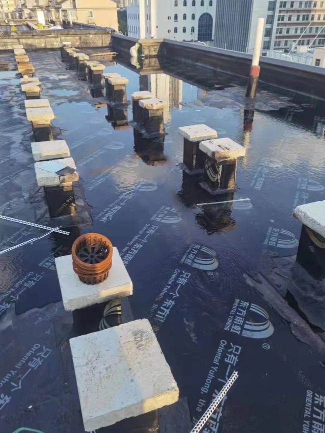 首先,屋面全部涂抹 固化橡膠瀝青防水涂料 ,然后鋪設卷材,之后還要進行嚴格的閉水試驗,檢驗防水效果。