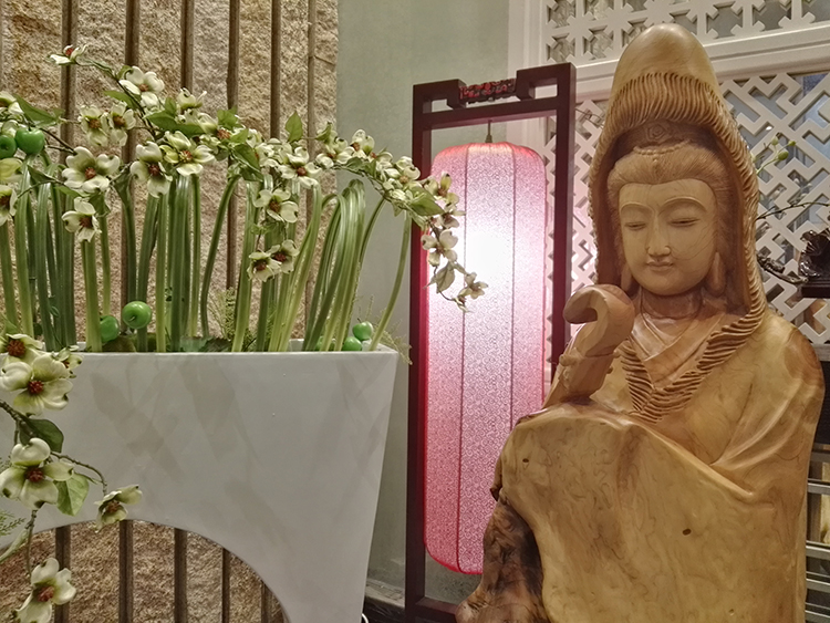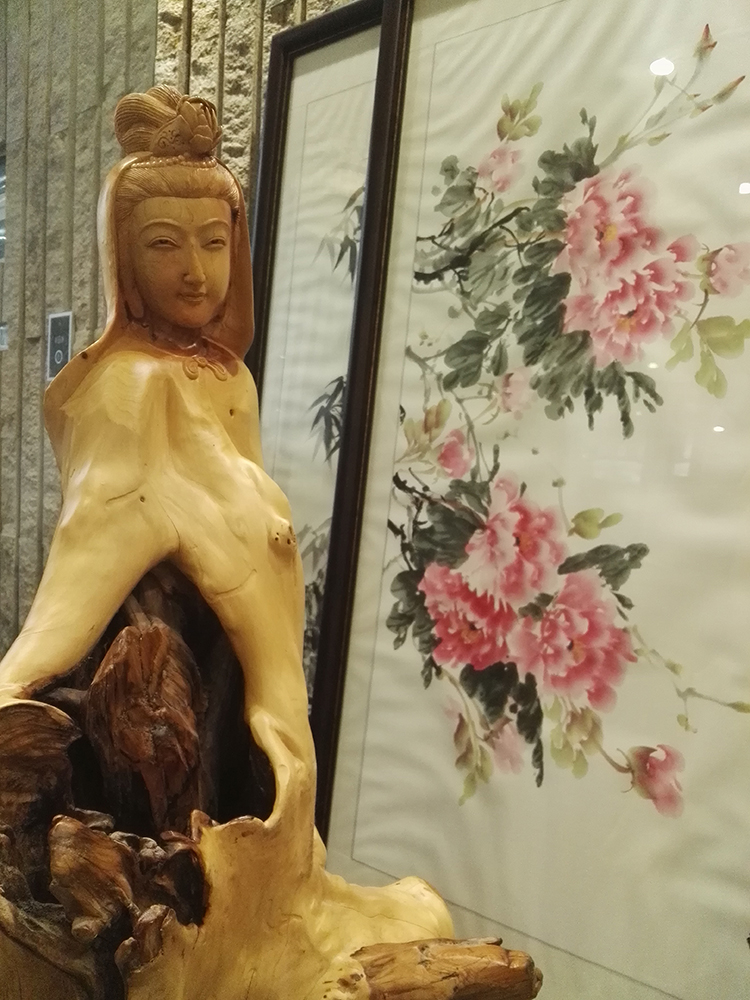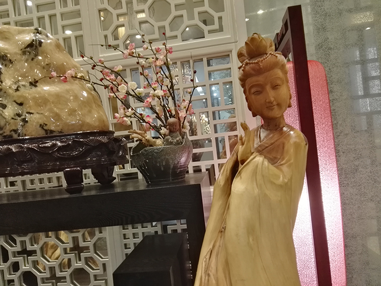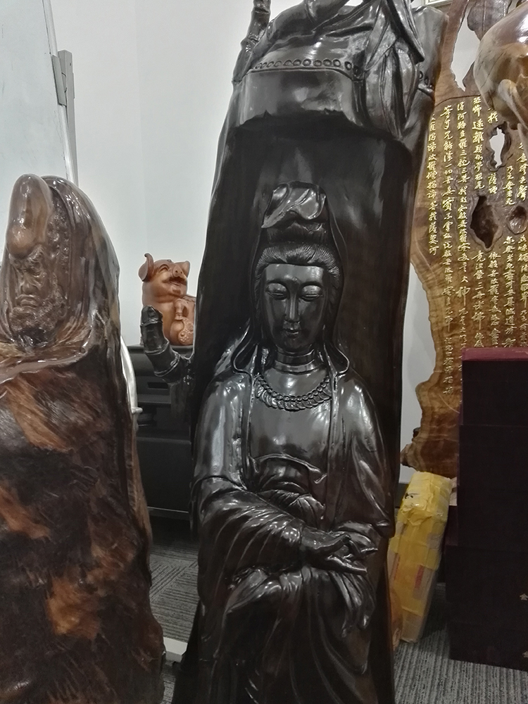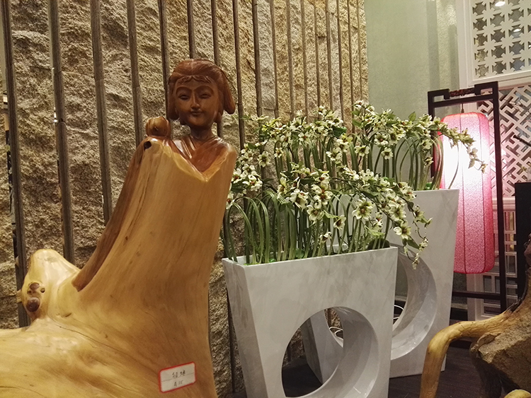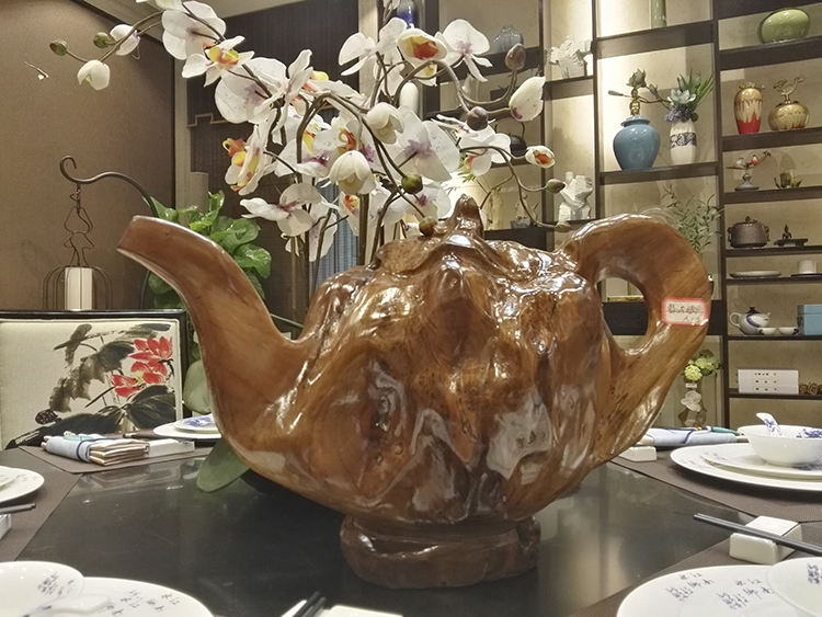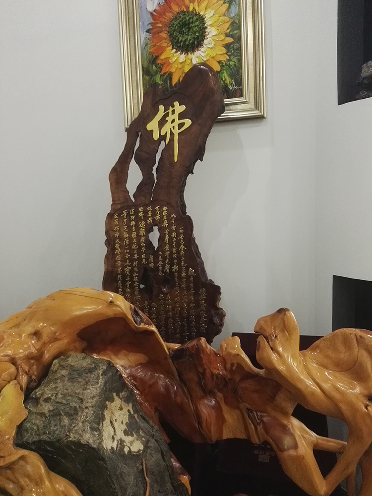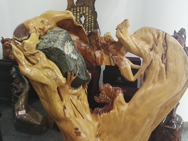 劉總向陳先生介紹寶億萊軟裝如何運(yùn)用根雕藝術(shù)品