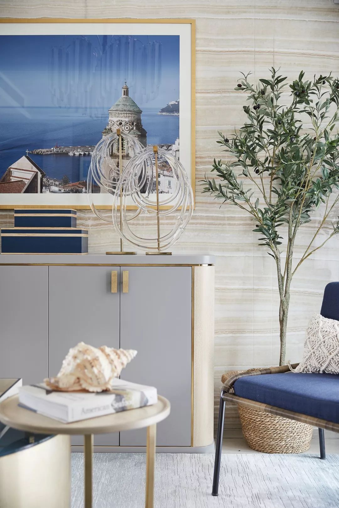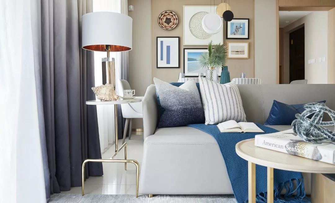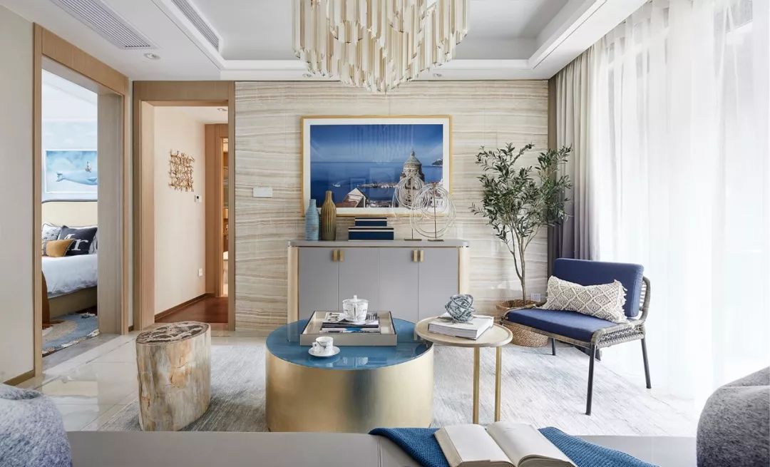正如靈感之地阿瑪爾菲海岸多變而豐富的色彩,以高級感的米灰色、原木色為空間基調(diào),同時運用深淺不一的五十度藍(lán)貫穿始終,如果說色彩為空間定下了海岸度假的風(fēng)情和基調(diào),那么材質(zhì)運用就是設(shè)計師賦予空間的品質(zhì)與要求。