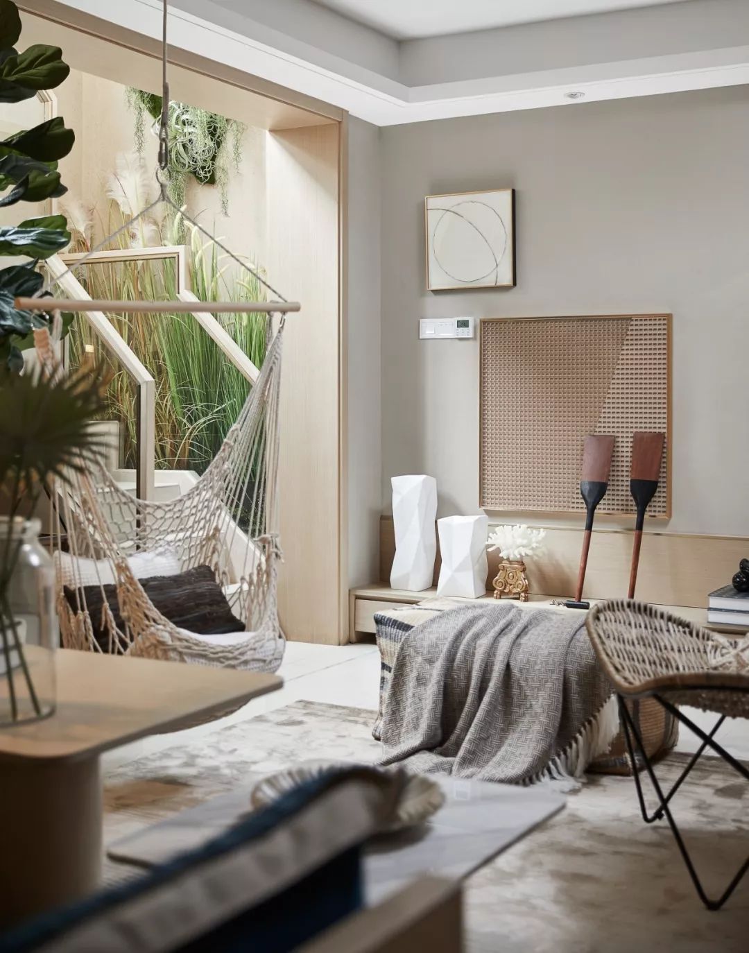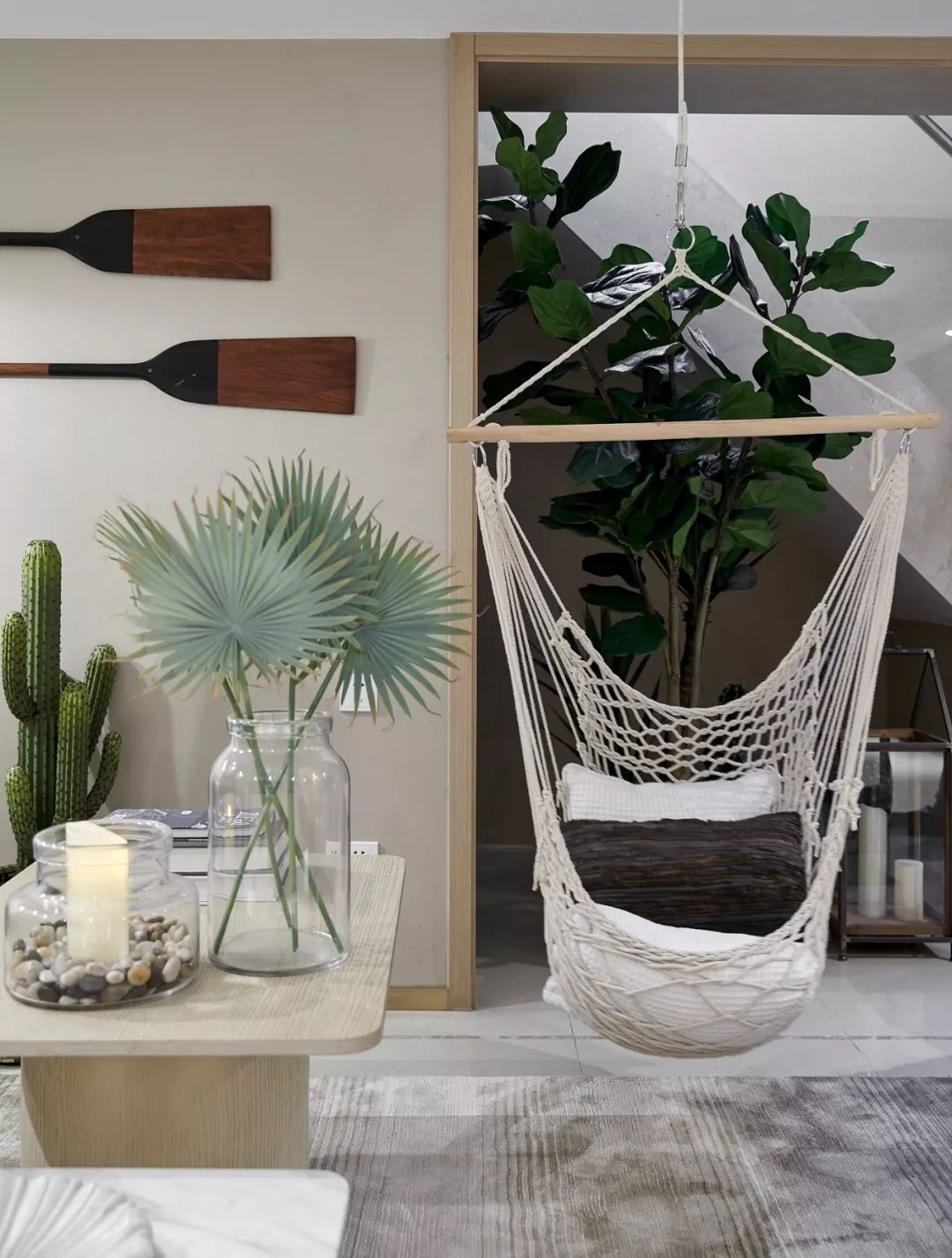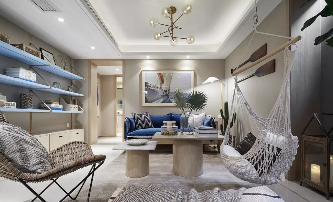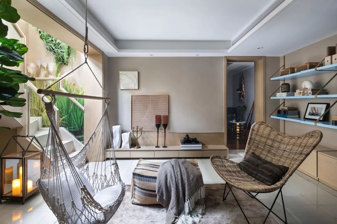 所有愿意揮霍的時間都不是虛度,包括躺在吊床上瞇個午覺。夢里有沙灘、陽光、笑聲、還有家人…….自由隨性的氛圍充盈在四墻之內(nèi)。置物架上的旅行紀(jì)念品、書籍、風(fēng)燈訴說著上一次的難忘。也是下一場旅行的約定。