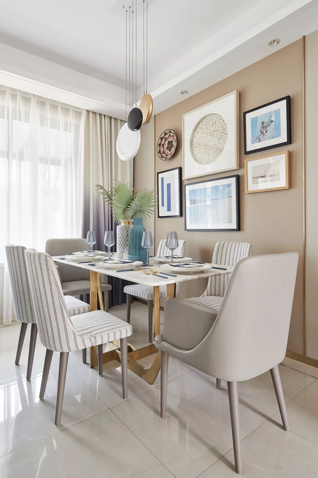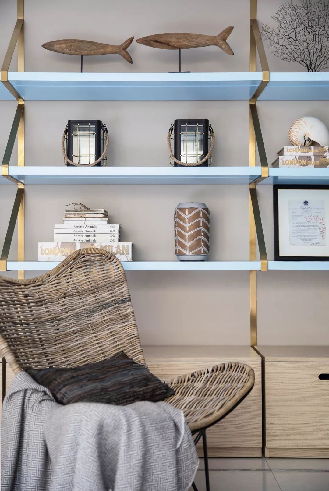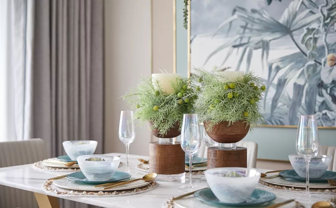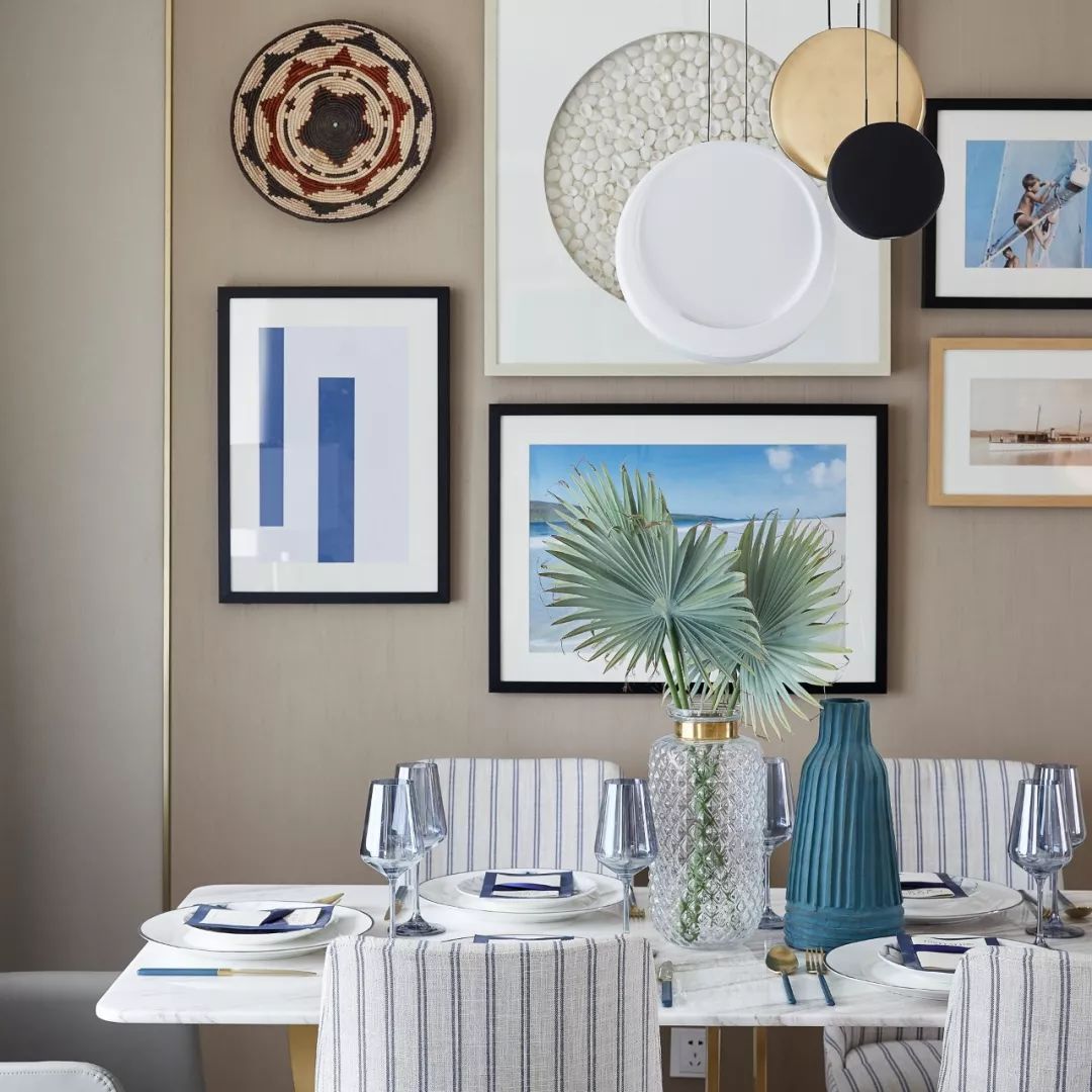 草編藝術(shù)品和陶土器皿呼喚出海濱小城的生活氣息??臻g的米灰色彩并不搶眼,但餐桌上偶爾一兩點跳躍的藍(lán)色卻恰到好處地調(diào)動起生活的熱情,哪怕只是幾個清透的藍(lán)色高腳杯,也能裝飾出一個海邊的甜夢。