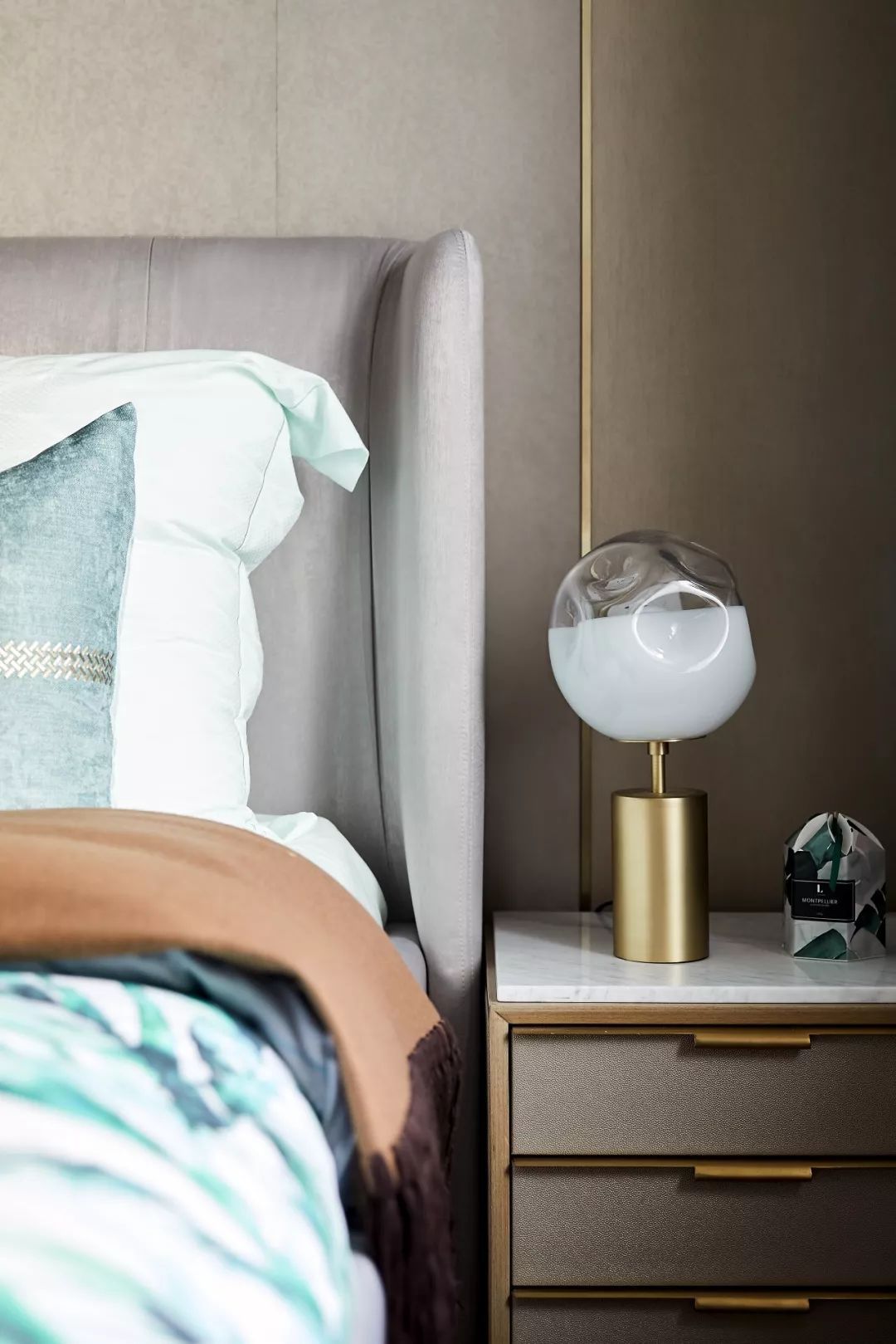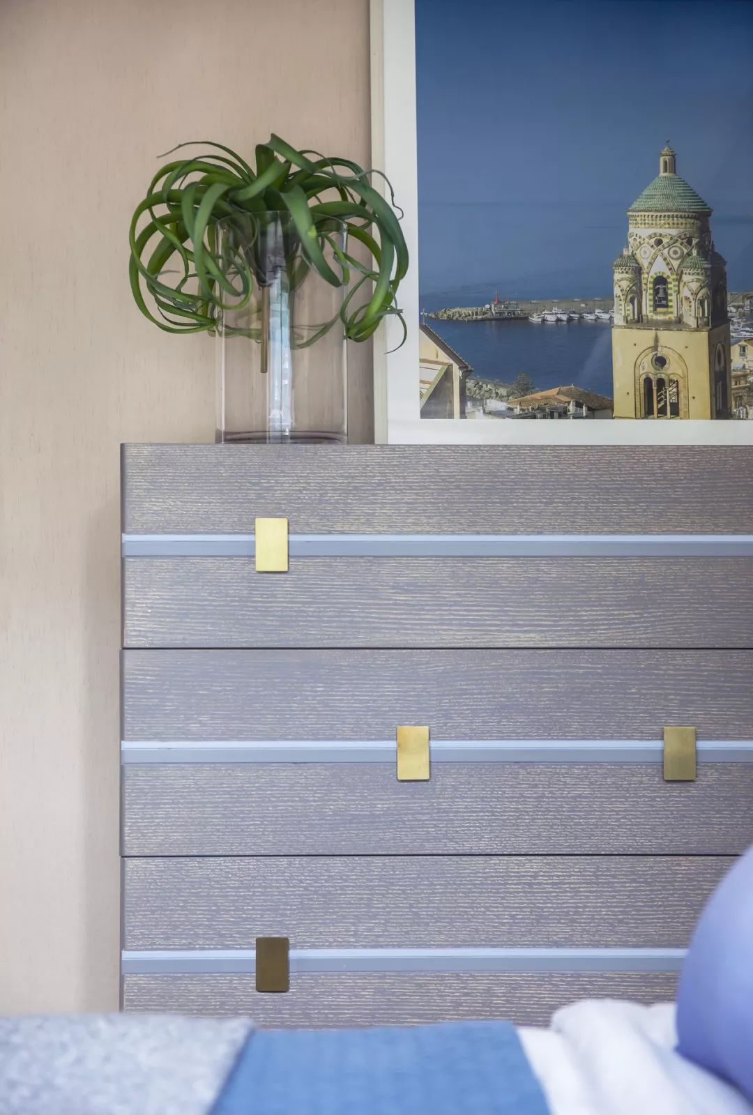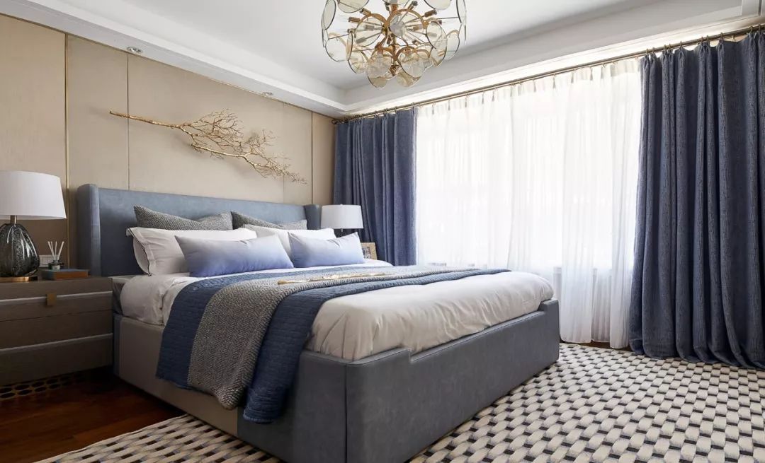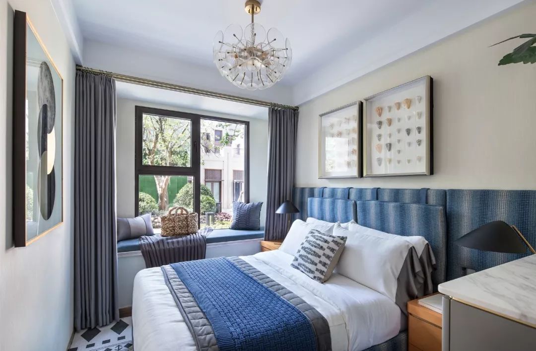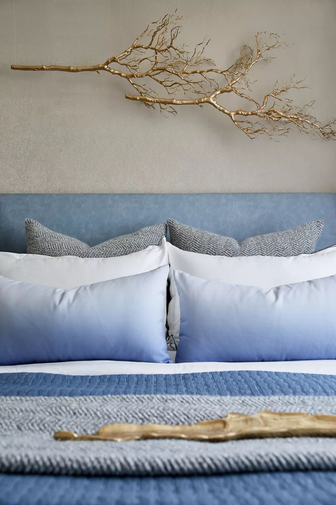 碾碎了地中海的陽光,又揉了一些金,床頭的兩枝鎏金的樹枝給度假風(fēng)格增添了奢華氣息。主臥室延續(xù)了高潮迭起的漸變藍(lán)色調(diào),床品應(yīng)用不同的肌理和顏色的搭配,在層次中翻卷浪花。