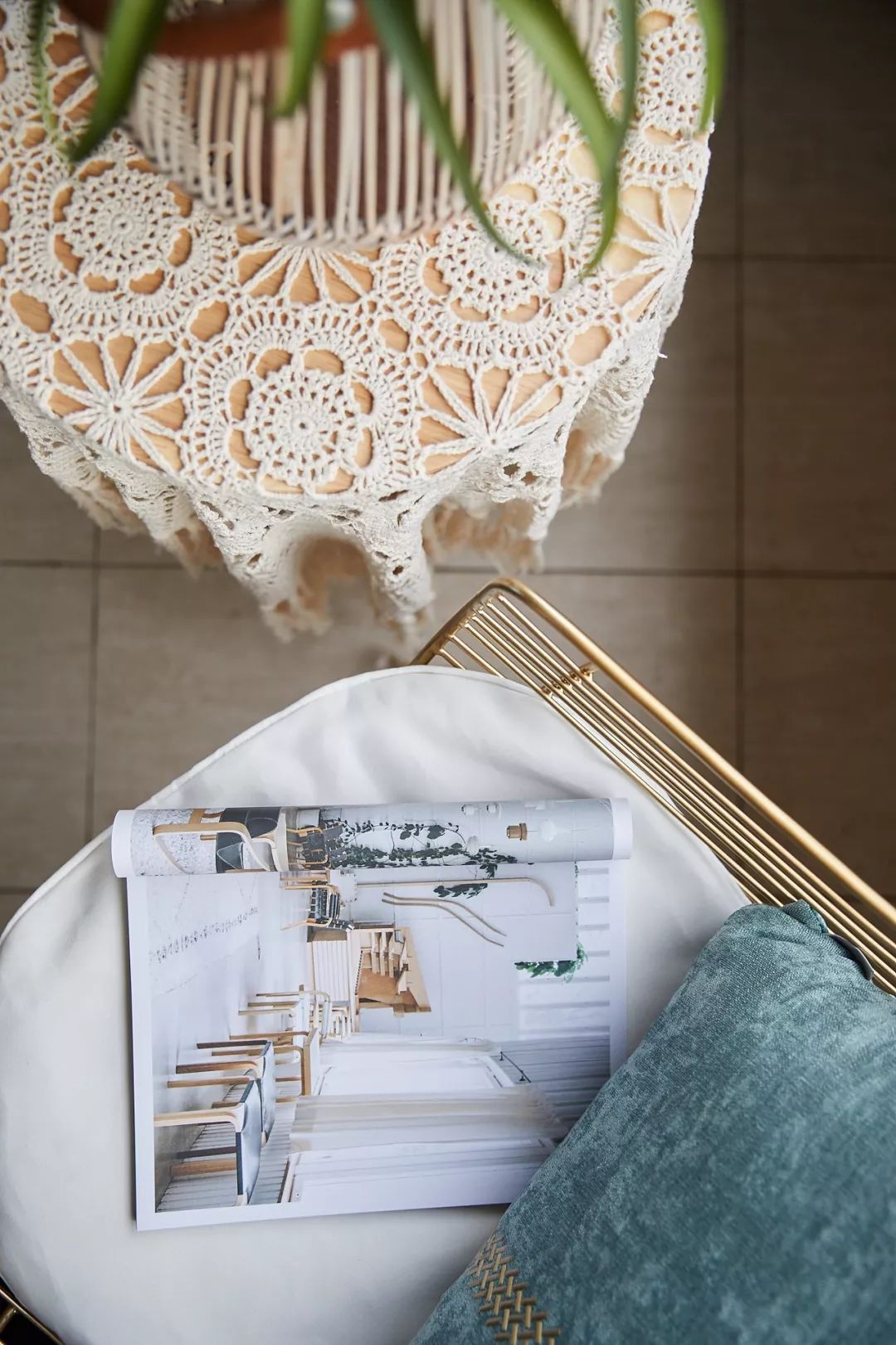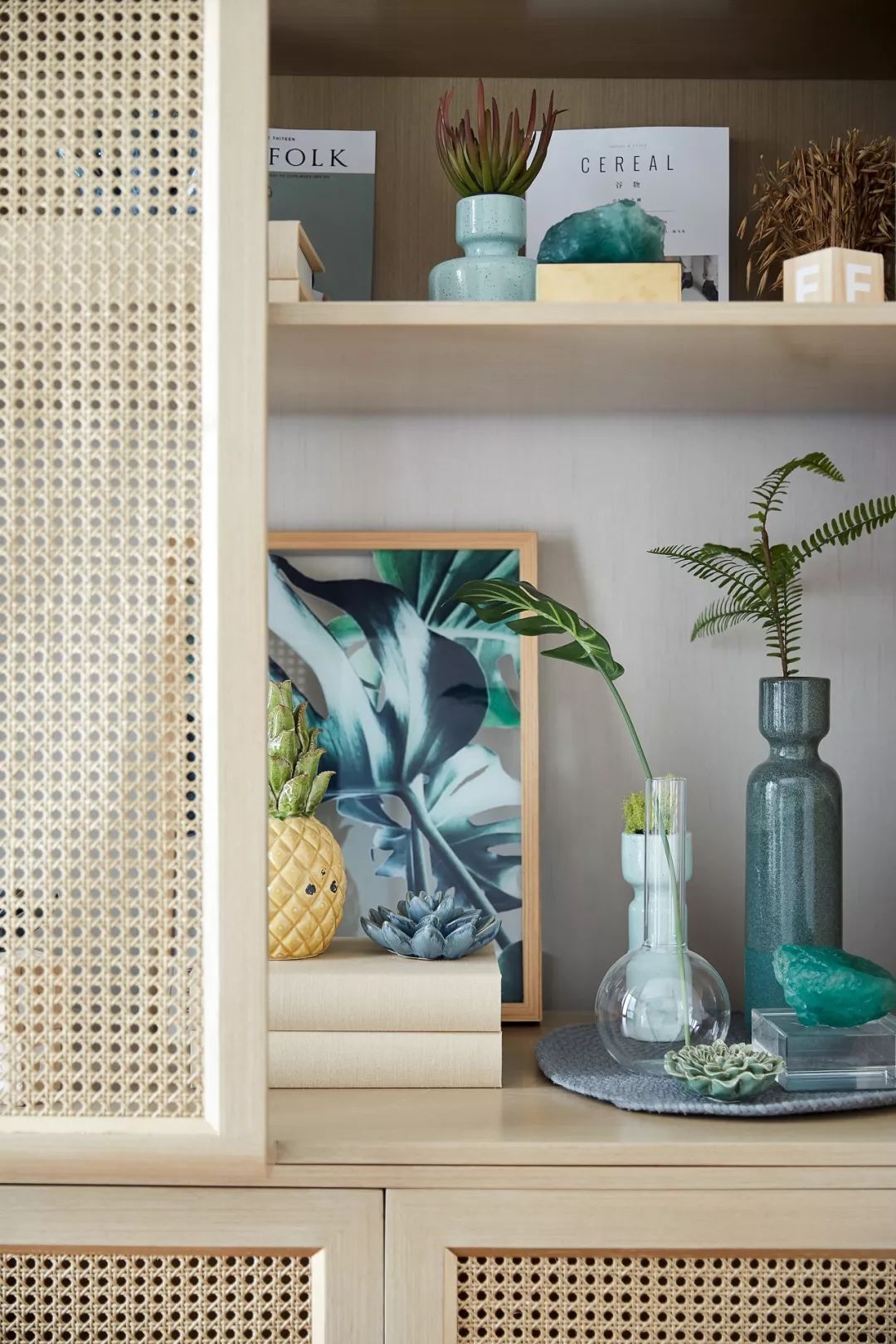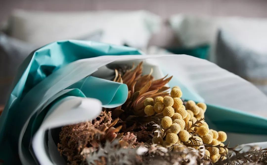 LLiving 床品,寬大的棕櫚葉紋樣成為最矚目的焦點;定制的復(fù)古花紋衣櫥、棕櫚葉掛畫、靠枕都與之呼應(yīng),呈現(xiàn)出一股略帶復(fù)古又時尚的造型感。