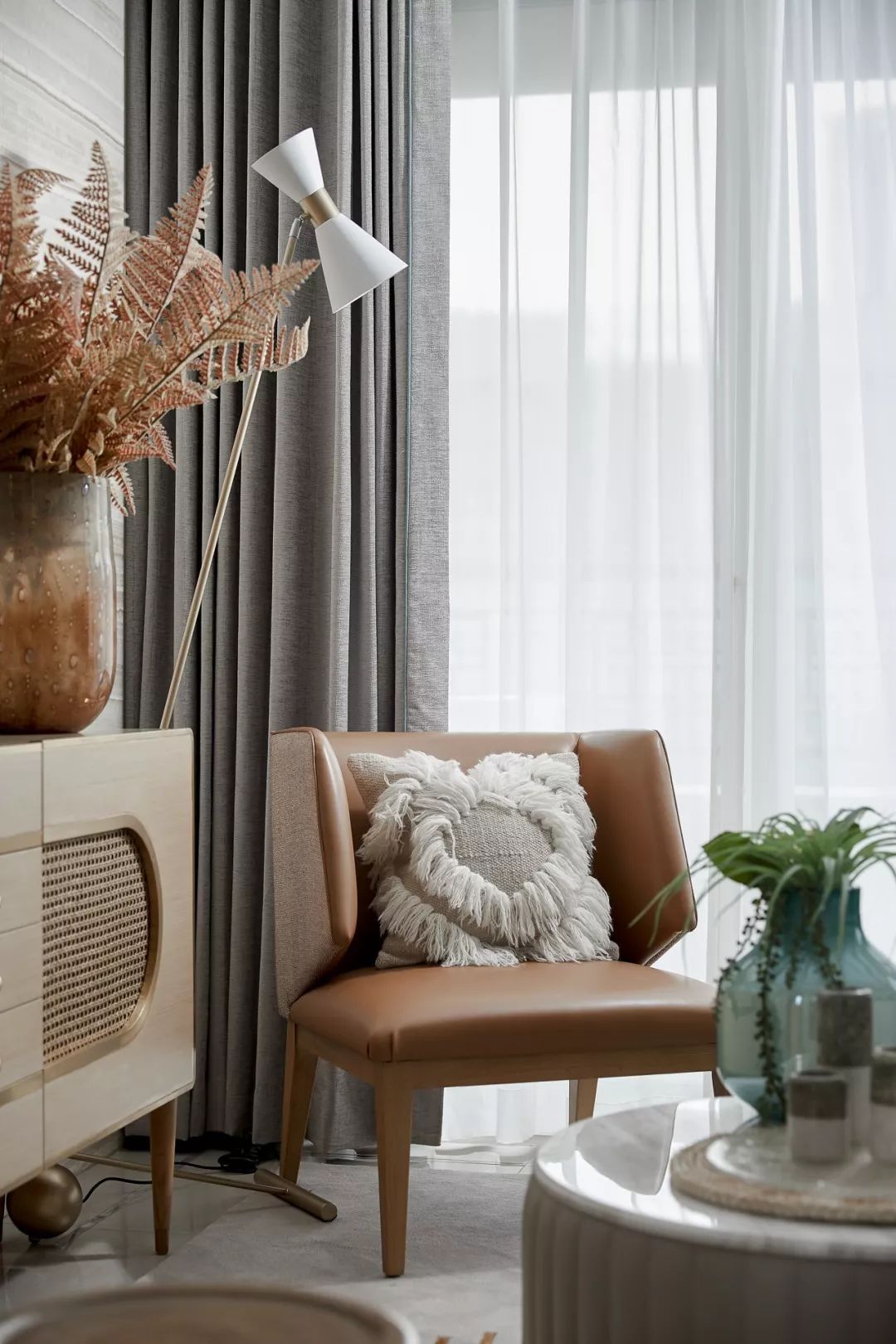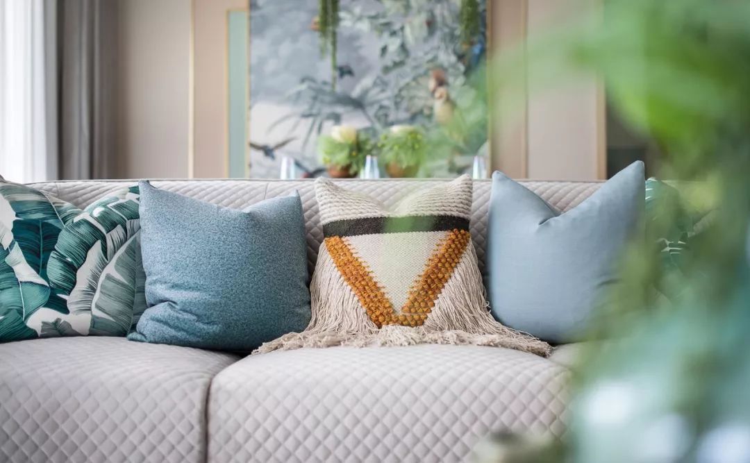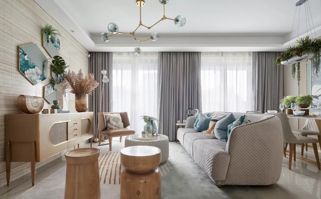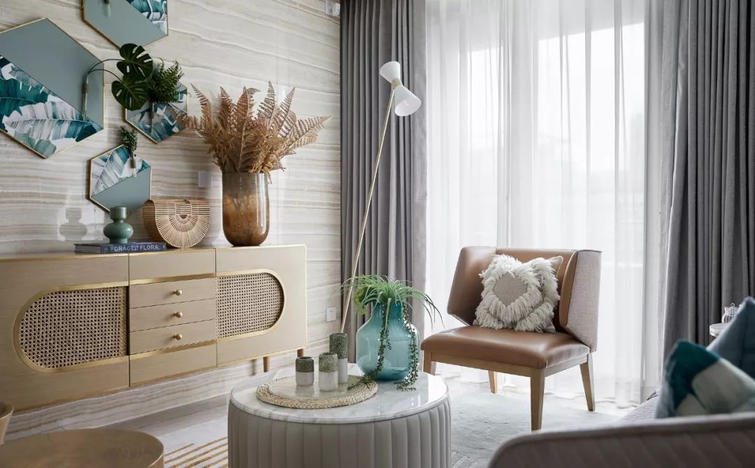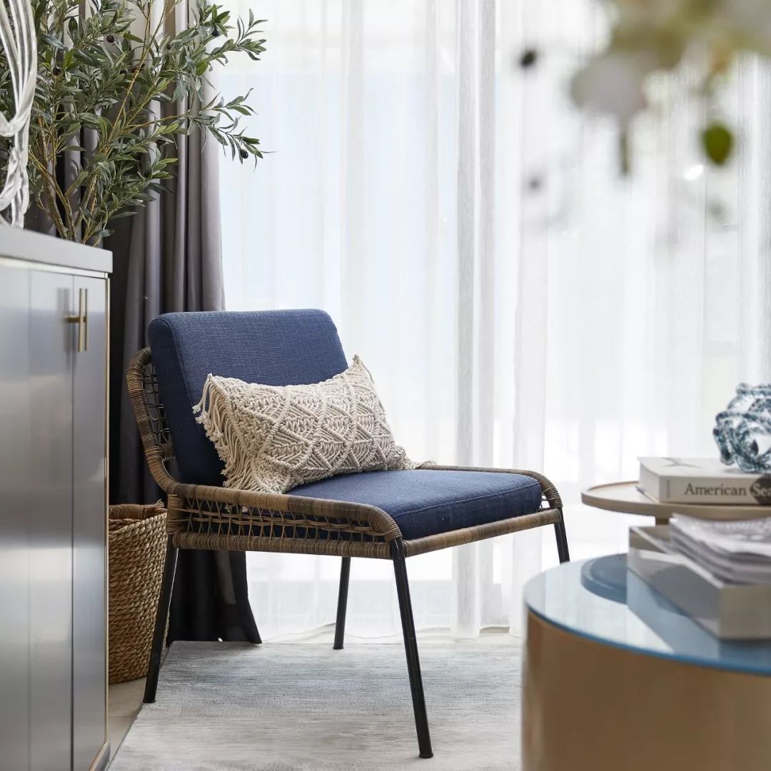 原木色坐具、棉麻抱枕、藤編收納裝飾,以繼續(xù)營造自然之味;絨布沙發(fā)與金屬鑲邊的邊柜,淺棕色皮革扶手椅等不同材質(zhì)家具的混搭,則讓空間在休閑自然中多了幾分我們對于生活的態(tài)度。窗外是焦躁的炎夏,屋內(nèi)柔軟而清新的織物寬慰著倦怠的身體,感受陷入溫柔的擁抱。