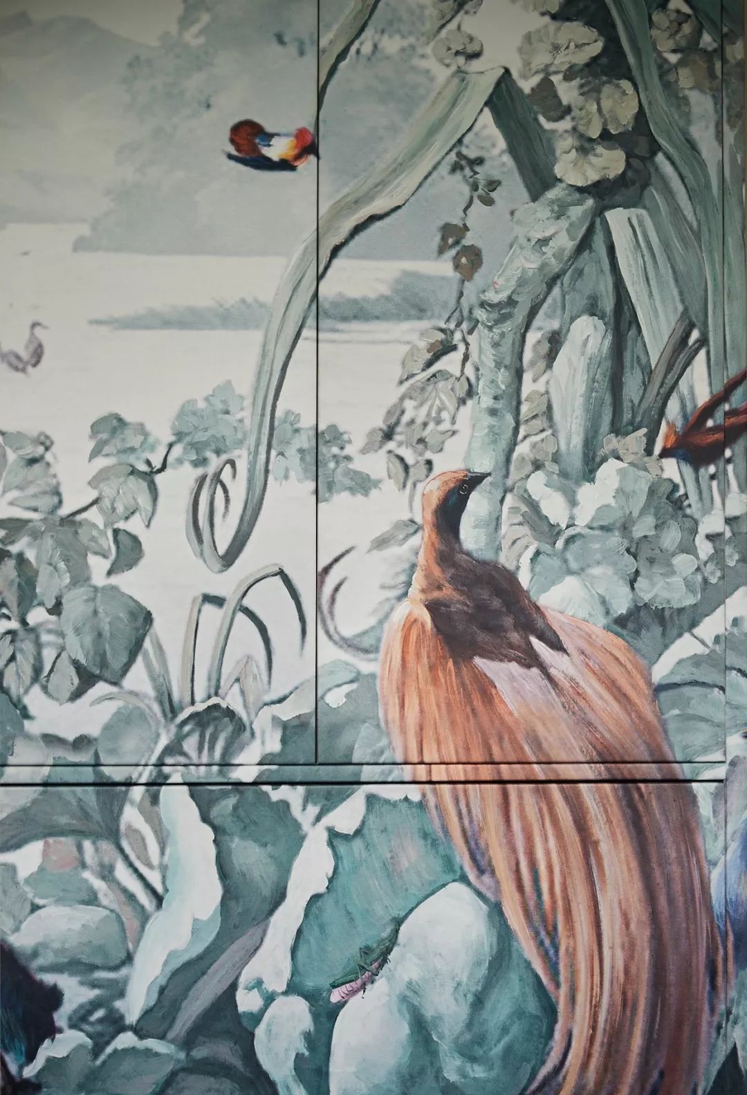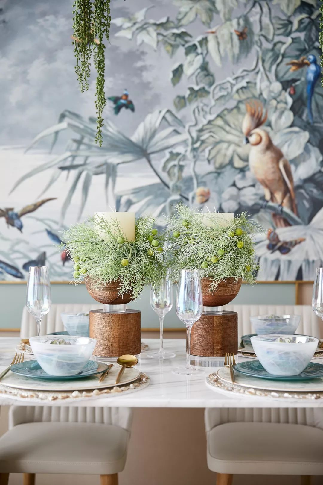 生活的煙火氣在餐桌彌漫而開,郁郁蔥蔥的植被、灑脫的熱帶植物和鳥類,或在墻體或在碗里。