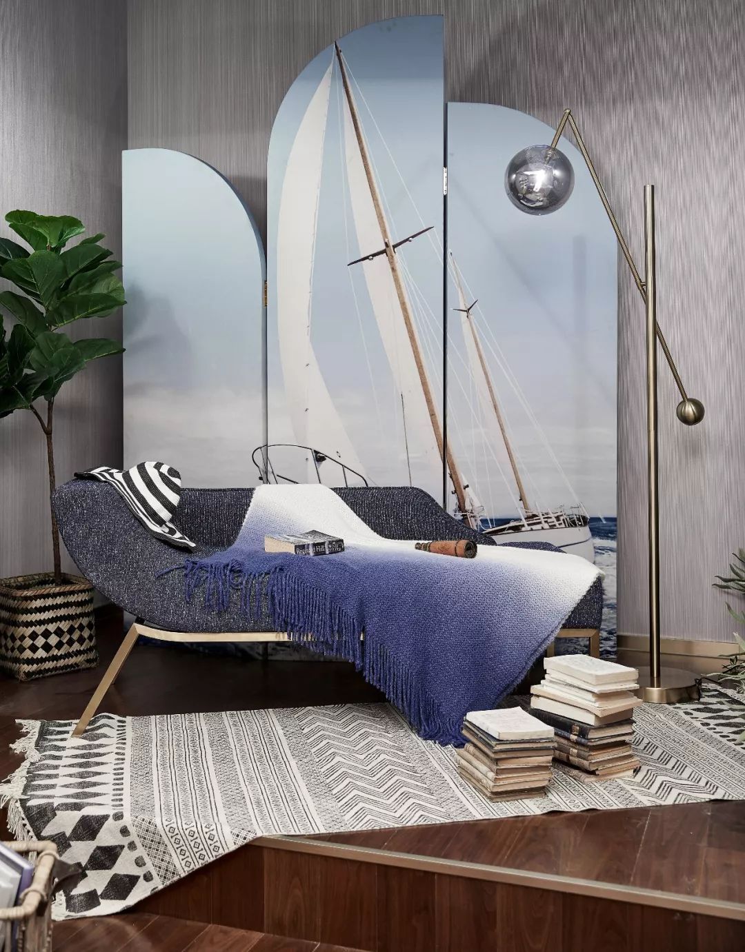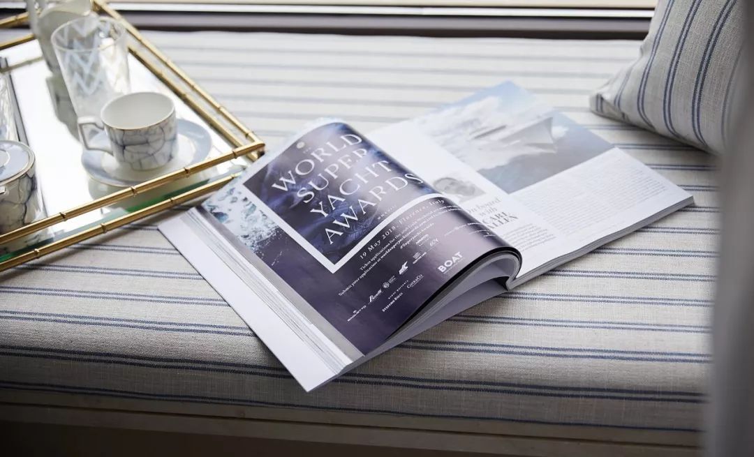 我們愛大海波瀾壯闊的閃光時刻,也愛大海包容大度的深邃廣闊??团P顯示出海洋包容大度的一面,深沉的藍(lán)色通過漸變的織物傳遞出靜默的美感。墻上掛著的貝殼標(biāo)本亦是來自海洋的饋贈。
