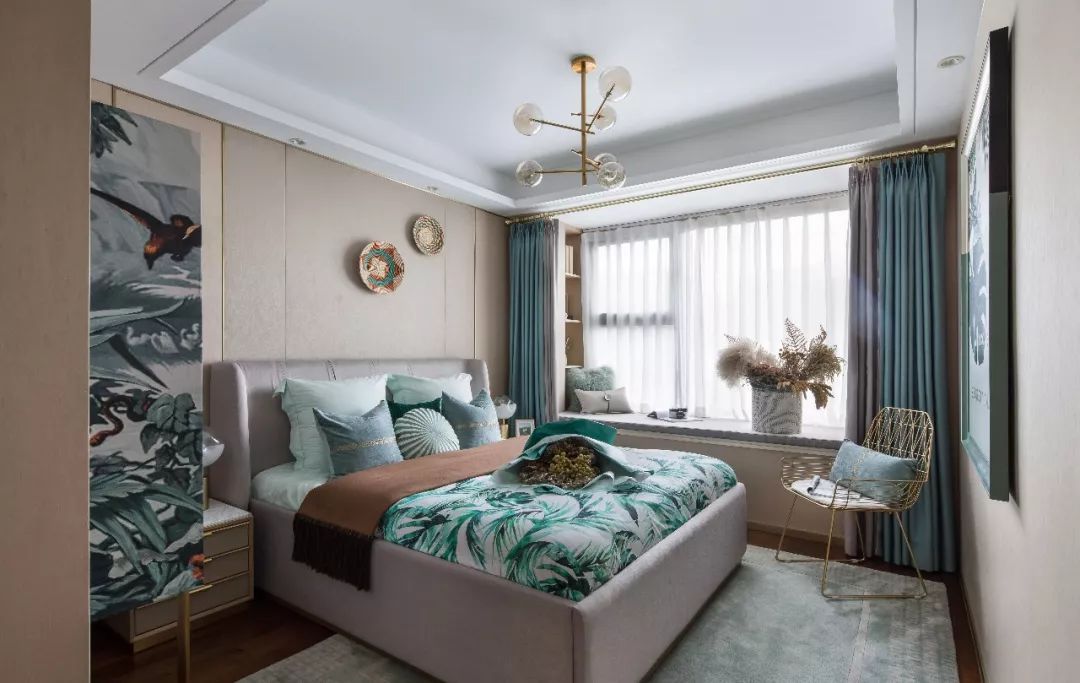 綠色,生機盎然的色彩,在午后的陽光里變得透明,一切變得很微妙。眼神逐漸有了溫度,情感有了起伏。清爽、舒心的氣息隨著大面積的印花而蔓延,多種闊葉的迸發(fā)為臥室?guī)肷钌顪\淺的綠色,在熱帶雨林中入眠的美夢就這樣實現(xiàn)了。