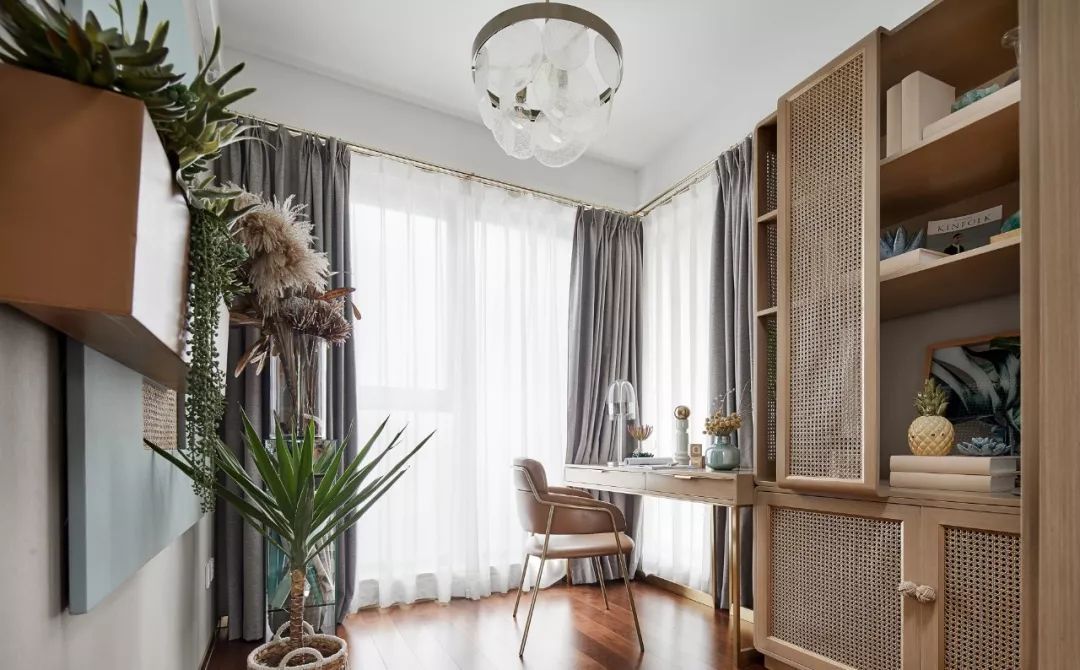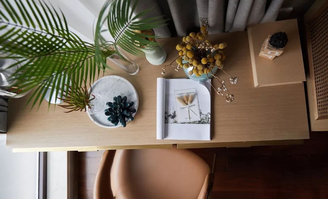 站在書房落地窗前,感到黃昏的陽光溫柔地灑在身上,一切可以停止,在綠植簇?fù)淼姆块g里安靜的讀一會兒書,這是一周中最奢侈的時刻。用不同形態(tài)的植物或者容器,在書房里營造「一步一景」的體驗感。