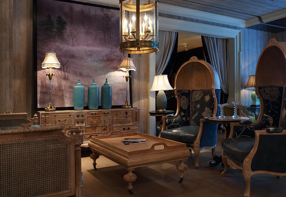 居室中廣泛運(yùn)用的藤、鐵藝、木等天然材質(zhì),內(nèi)斂莊重的深木色
