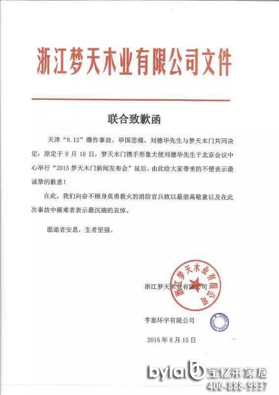 今日,記者接到夢天木門和知名藝人劉德華方面的致歉信,原定于8月18日在北京會議中心舉辦的新聞發(fā)布會,將延期舉辦。據(jù)悉,劉德華已接受夢天木門邀請,作為形象大使代言夢天木門,雙方將在近期公布代言事宜。