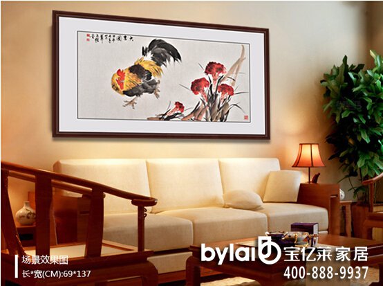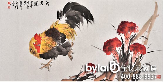 家居墻面裝飾畫舉例解析:在中國古代,雄雞一直被文人們所稱贊�!断嚯u經(jīng)》中曰:“雞有五德,頭戴冠者,文也;足搏距者,武也;敵在前敢斗者,勇也;見食相呼者,仁也;守夜不失時者,信也”。同時,雞又與“吉”諧音,為吉祥的象征,因此歷來為畫家樂于表現(xiàn)的題材。