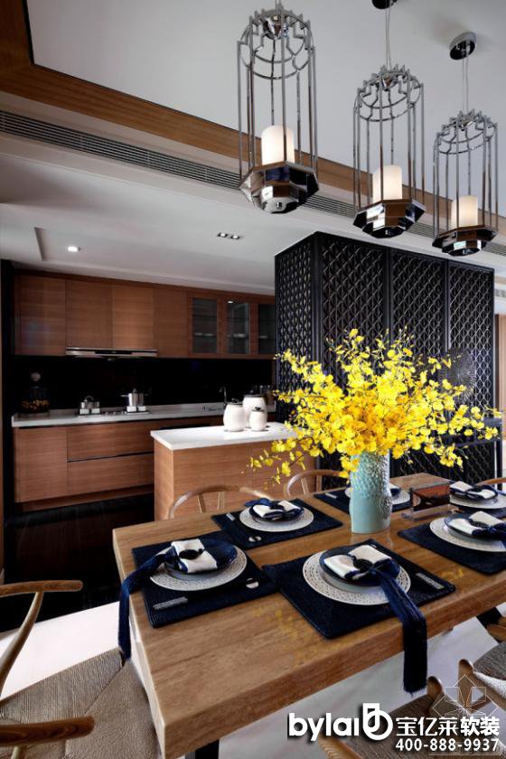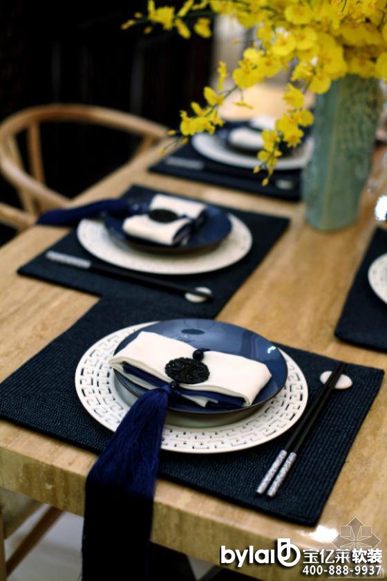 新中式的質(zhì)樸清雅總令人陶醉。在該樣板房設(shè)計中,設(shè)計師選用的原木餐桌、藏藍與白瓷餐具,帶來新中式清雅質(zhì)樸的韻味。