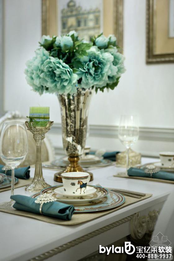 經(jīng)典的歐式古典餐桌椅搭配同色系的餐具,整體營造出典雅閑適、純美浪漫的用餐氛圍。從餐廳的空間架構(gòu)到餐桌的軟裝配色,都傳遞著設(shè)計師對美學(xué)品位和生活品質(zhì)的追求,情調(diào)而不做作,浪漫而不矯情。