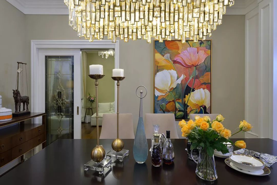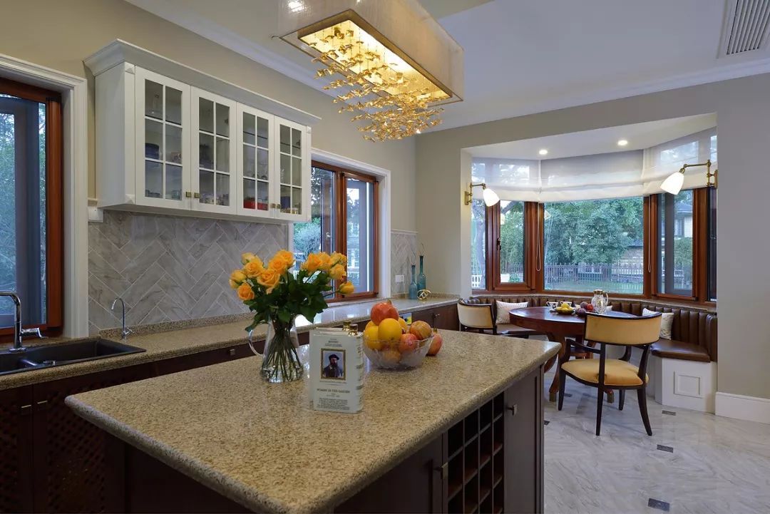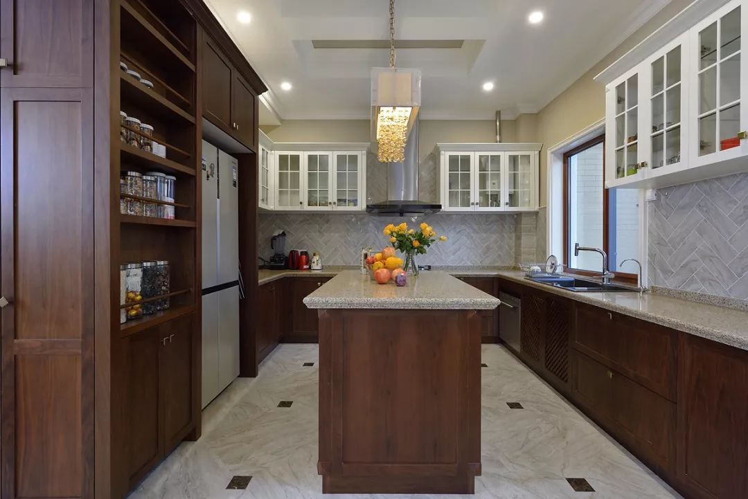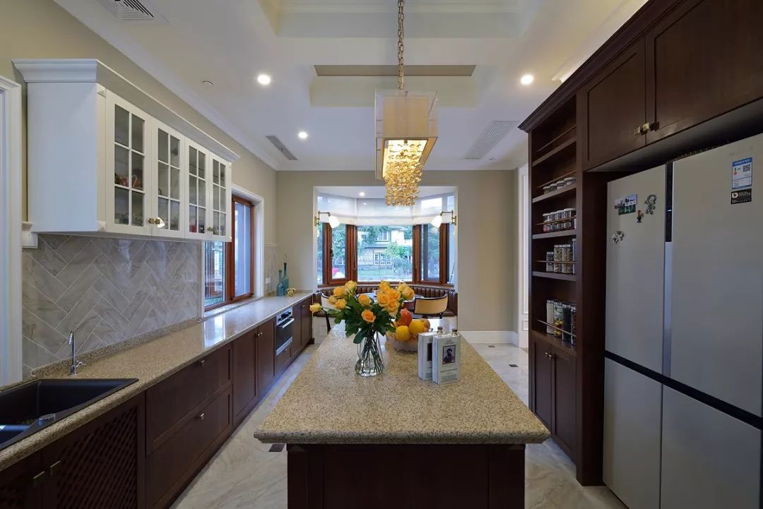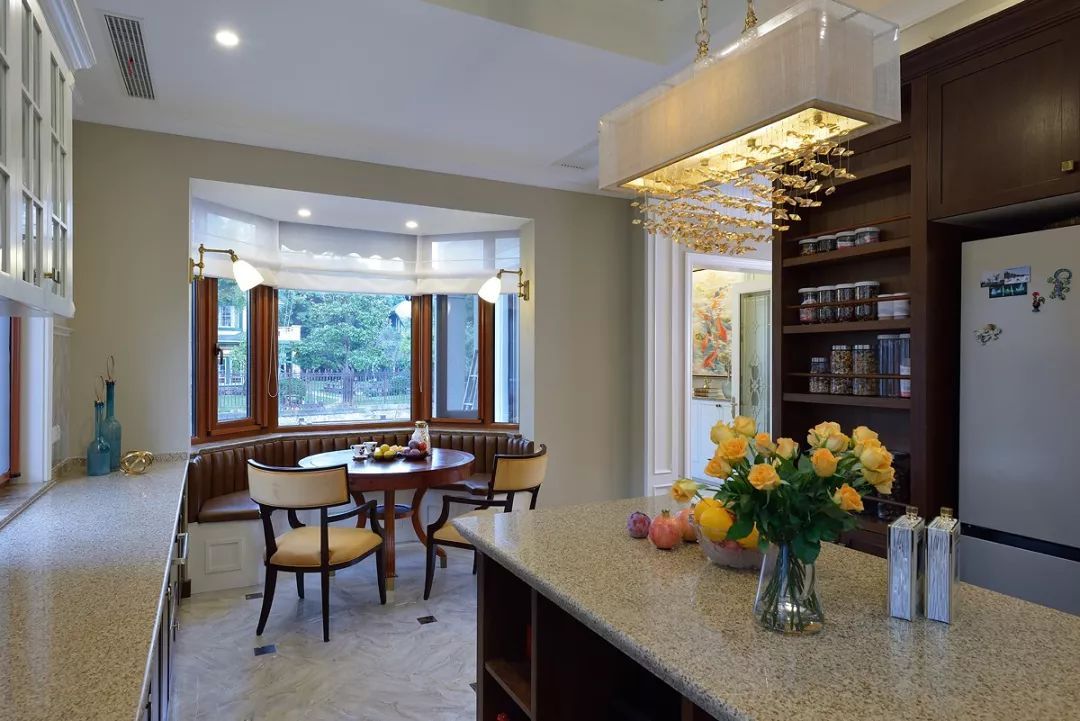 開放式廚房中西結(jié)合采光不屬于其他空間,中間的島臺即使會客也能從容應(yīng)對,便美式的用餐習(xí)慣和社交形式,一家人的溫和與融合也能在房間功能上有提現(xiàn)。