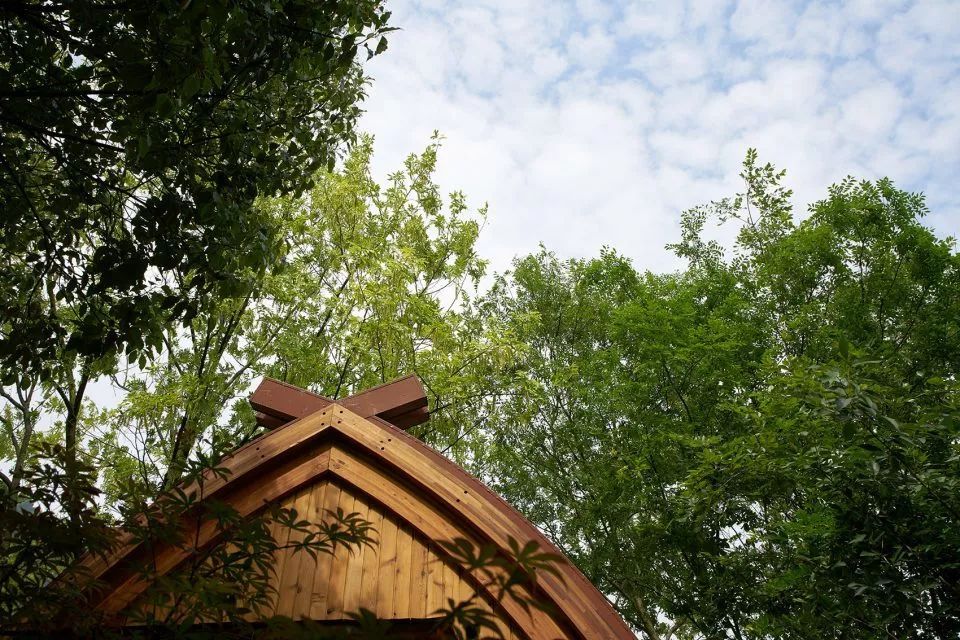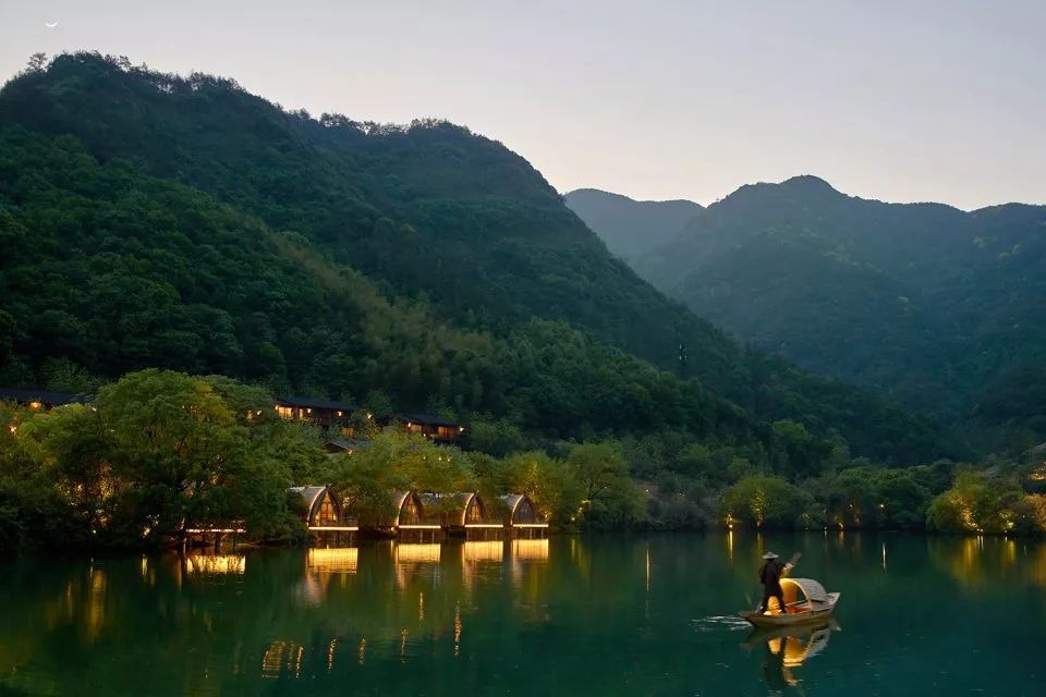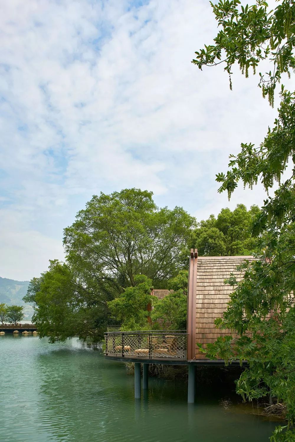 船屋坐落在建德富春江畔,是杭州富春開元芳草地鄉(xiāng)村酒店的一組特色船屋客房。其概念和形態(tài),源自當(dāng)?shù)氐墓爬巷L(fēng)俗。明初至清中幾百年間生活在這里的水上部落–“九姓漁民”,形成獨有的船居文化。五艘船屋橫斜在樹冠之間,船身三分之二飄在湖面上,輕盈靈動。作為酒店客房,船屋也成為當(dāng)下一種獨特的居住體驗,在50平方米的空間內(nèi),岸上的船尾作為入口玄關(guān)和衛(wèi)生間。中間頂部設(shè)置天窗成為室內(nèi)的景框,天光樹影共徘徊,時而有飛鳥掠過。船頭整面落地窗,即使坐在沙發(fā)上亦可感受煙波浩瀚,站上延伸至湖面的超大露臺靠著麻繩網(wǎng)欄桿,憑欄遠(yuǎn)眺,野曠天低樹,夜幕降臨,江清月近人。