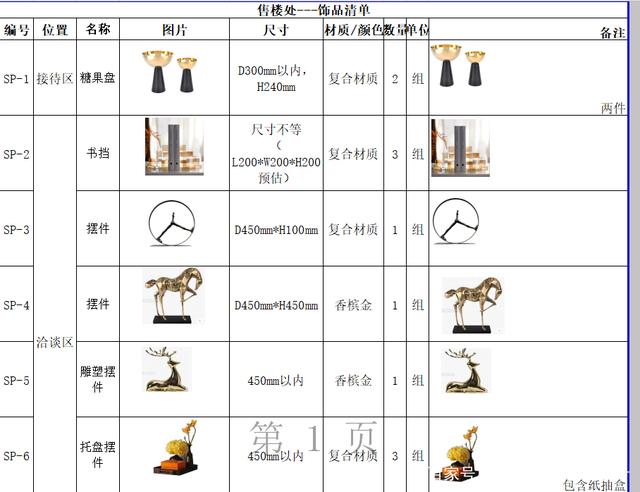 售樓處軟裝設(shè)計(jì)清單,售樓部軟裝設(shè)計(jì)所需要的物品清單,這是其中一個(gè)售樓部軟裝的軟裝清單,寶億萊售樓部的軟裝主要是根據(jù)清單的物品進(jìn)行采購(gòu),當(dāng)然,前期設(shè)計(jì)師會(huì)設(shè)計(jì)出售樓部的效果圖,客戶滿意后,根據(jù)效果圖上的物品列出的清單,向上面這種。售樓處花費(fèi)最大的地方就在這清單上面。寶億萊整體軟裝設(shè)計(jì):400-888-9937