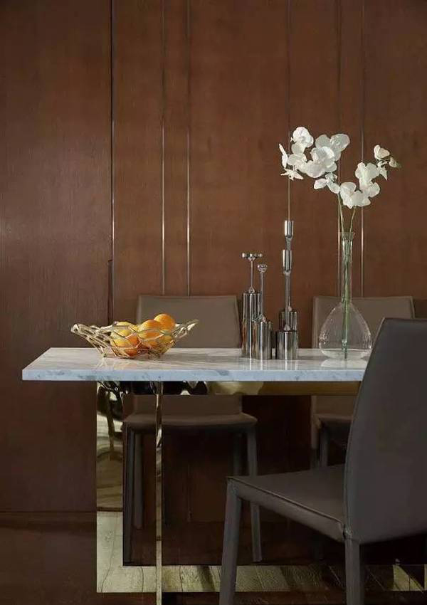 精致的深棕紋理染色木皮與米色壁紙勾勒深淺不一的層次感,令空間充盈著沉穩(wěn)、高貴的調(diào)性。設(shè)計(jì)師通過線條的分割與金屬材質(zhì)的點(diǎn)綴,散發(fā)摩登而略帶裝飾主義的低奢氣息。