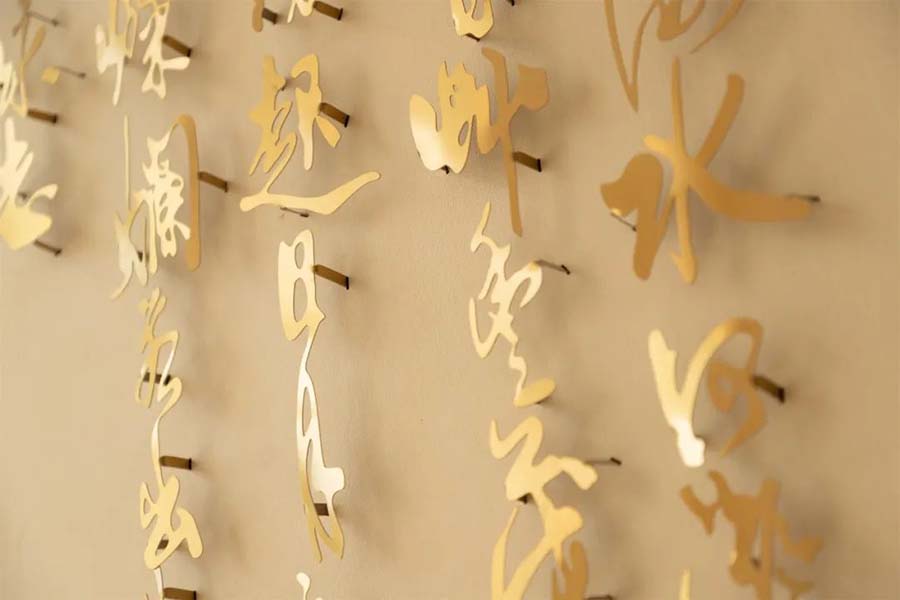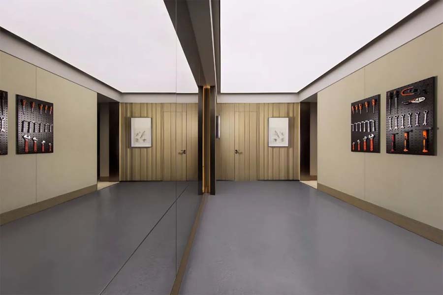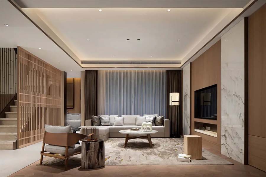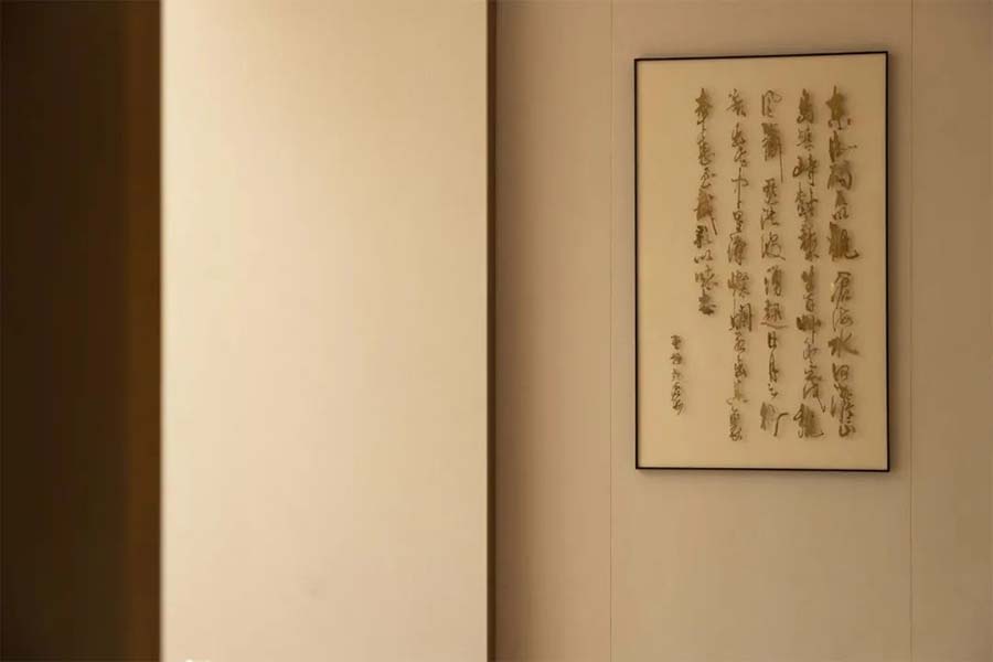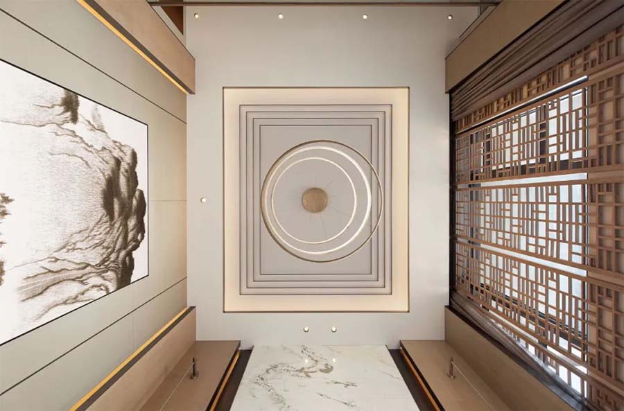 天、地、地都有禮節(jié)。山水畫中的大理石景觀紋理以筆直的線條為主要背景,園林框景的手法營(yíng)造了回旋重復(fù)的視覺美感;通透的花格在陽光的投射下,光影靈動(dòng),蘊(yùn)藏著足夠細(xì)膩的婉約。
