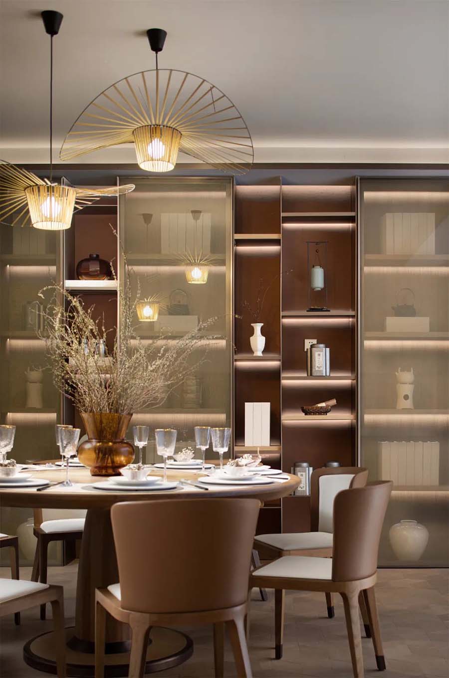 "美雕盤角黍競(jìng)時(shí),組繡風(fēng)華奉紫庭"。餐館的虛實(shí)柜體設(shè)計(jì),重疊的進(jìn)退體塊,配以紫砂色,并使家具皮面的局部點(diǎn)綴配合,化繁為簡(jiǎn),以“巧于因借,精在體中”的手法,結(jié)合紫砂色,使家具皮革局部點(diǎn)綴配合,來體現(xiàn)建筑美。