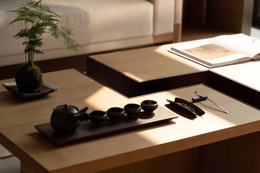由室外庭院走進(jìn)室內(nèi),茗茶區(qū)承載著情緒轉(zhuǎn)換的首要功能,挑空向上的體量,挺拔如峭壁。于是及里,層次的高低對(duì)比,塑造一種韻律感,讓都市的繁華和寧靜的閑適在瞬間找到一種平衡點(diǎn),俯瞰間盡是以小見大之妙。