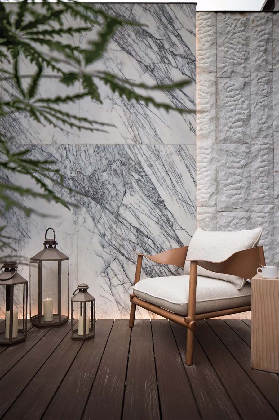 在天井里,創(chuàng)造出詩情畫意的生活場(chǎng)景,并以物見性、材料肌理來表達(dá)不同的情感:索色的塑木地板至素;白金米黃大理石溫潤(rùn)面的至雅;香梅雪大理石的溫潤(rùn)面;白水晶大理石斧剁面的至樸……咖啡一杯,休閑椅一把,幾盞燭光,享受不一樣的月光夜晚。