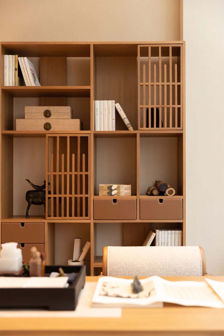 "門,必有出入",它不只是連接內(nèi)部空間和外部環(huán)境的通道,而是第一道空間層次。打開一看“山”,范寬的《溪山行旅圖》舒展在茶區(qū)一側(cè),跟入戶門形成一種巧妙的對(duì)景關(guān)系,視覺由近引向深遠(yuǎn),同時(shí)也是整體設(shè)計(jì)的內(nèi)核。立面構(gòu)造形態(tài)及家具擺放借鑒客家圍屋形式,中軸對(duì)稱,營(yíng)造莊重莊重的儀式感。