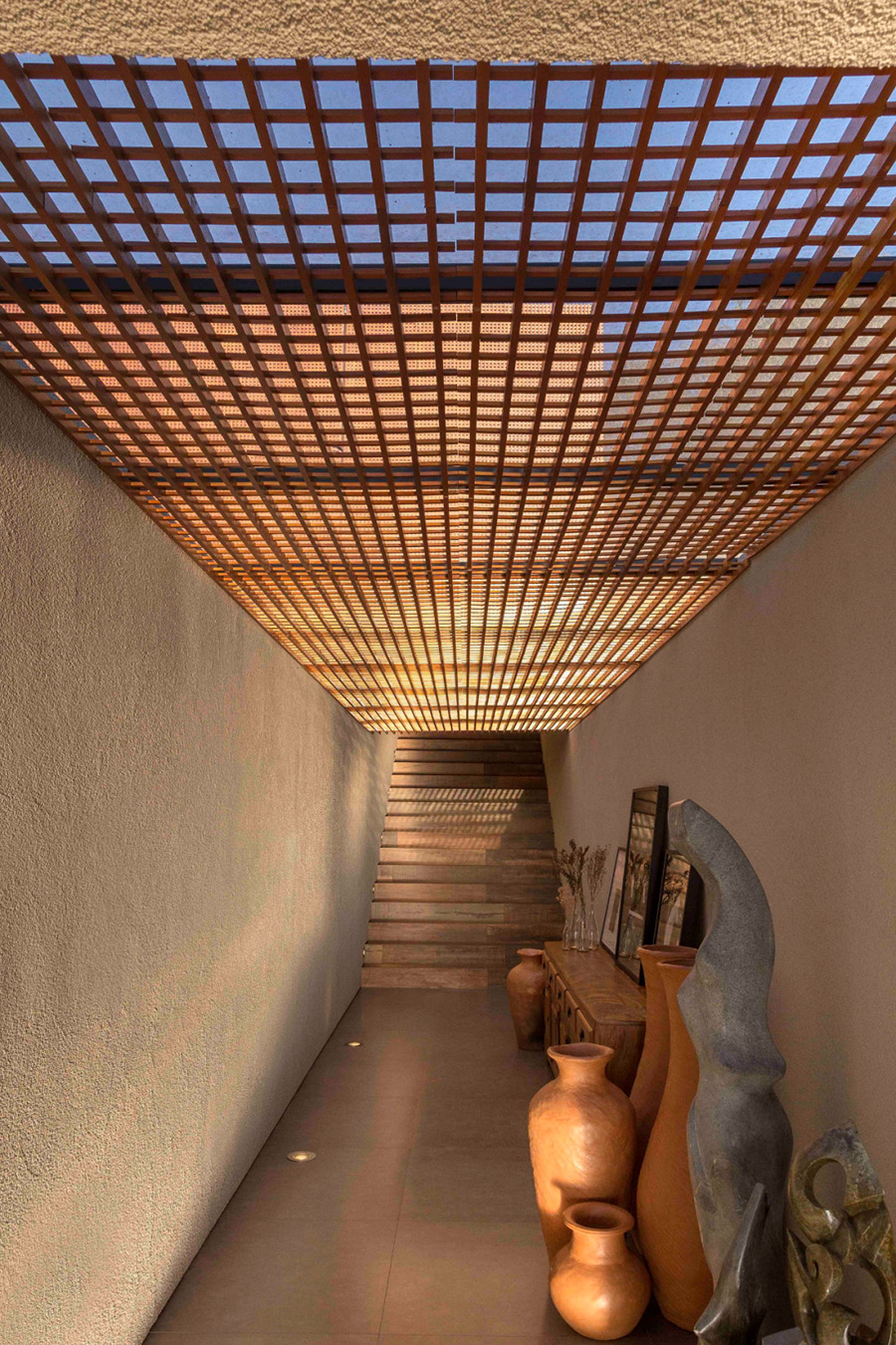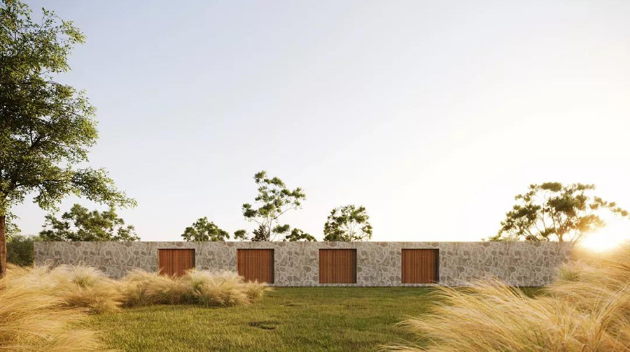 遠(yuǎn)眺群山,心情舒暢,住在這里就像來到世外桃源。整座建筑就像一座植根于山頂?shù)淖匀唤ㄖ?,面對著山脊敞開的平臺,錯(cuò)落有致的石墻,野蠻生長的自然景觀,共同營造出一種極簡靈動(dòng)的靜謐建筑。