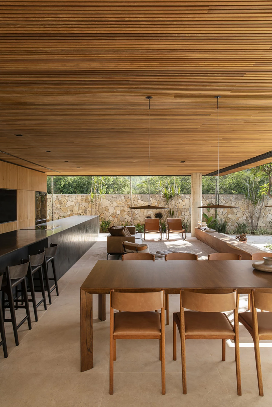 起居室、餐廳為自然三面開放狀態(tài),陽光、庭院、樹木、光影、風(fēng)、云、雨、水等自然元素與建筑無縫連接,營造一種輕松、自然、愜意的度假氛圍,適合放空、發(fā)呆、閱讀,與家人、朋友在此分享生活之樂趣。