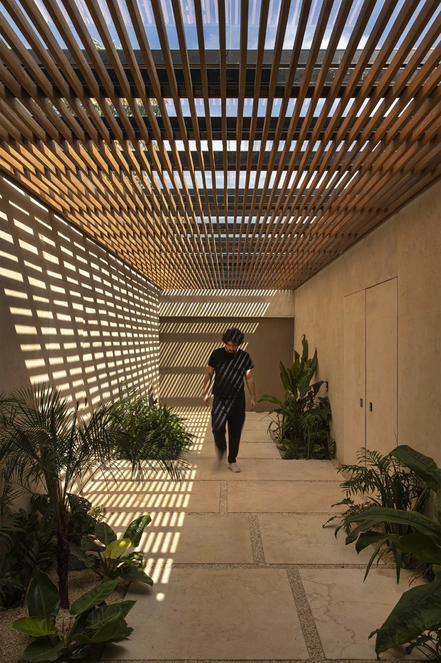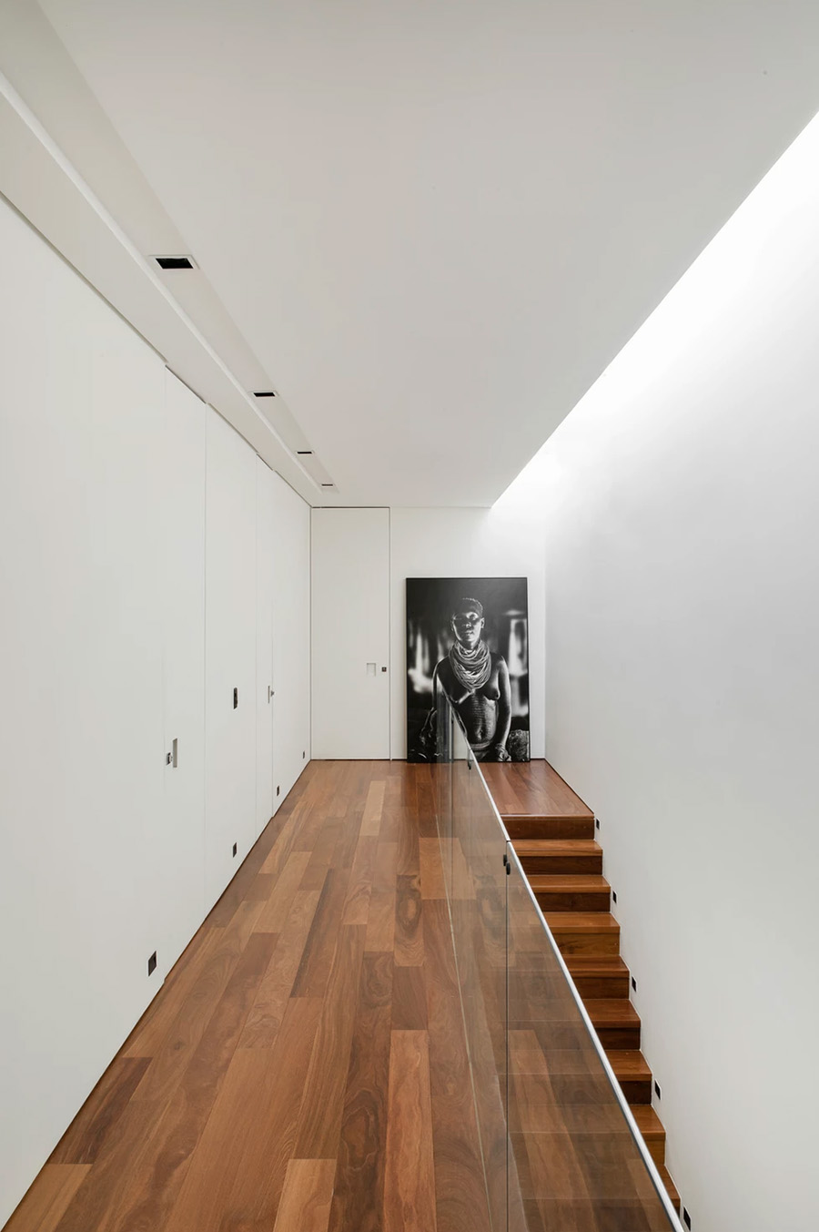 為使功能劃分更加明確,建筑師將住宅分成三個(gè)部分:靜區(qū)(臥室)、活動(dòng)區(qū)(客廳、餐廳、廚房)和庭院。走進(jìn)住宅,由簡約的現(xiàn)代大門即是充滿自然氣息的光廊,讓人進(jìn)入寧靜的氛圍,兩邊種滿綠植,讓室內(nèi)自然愜意。