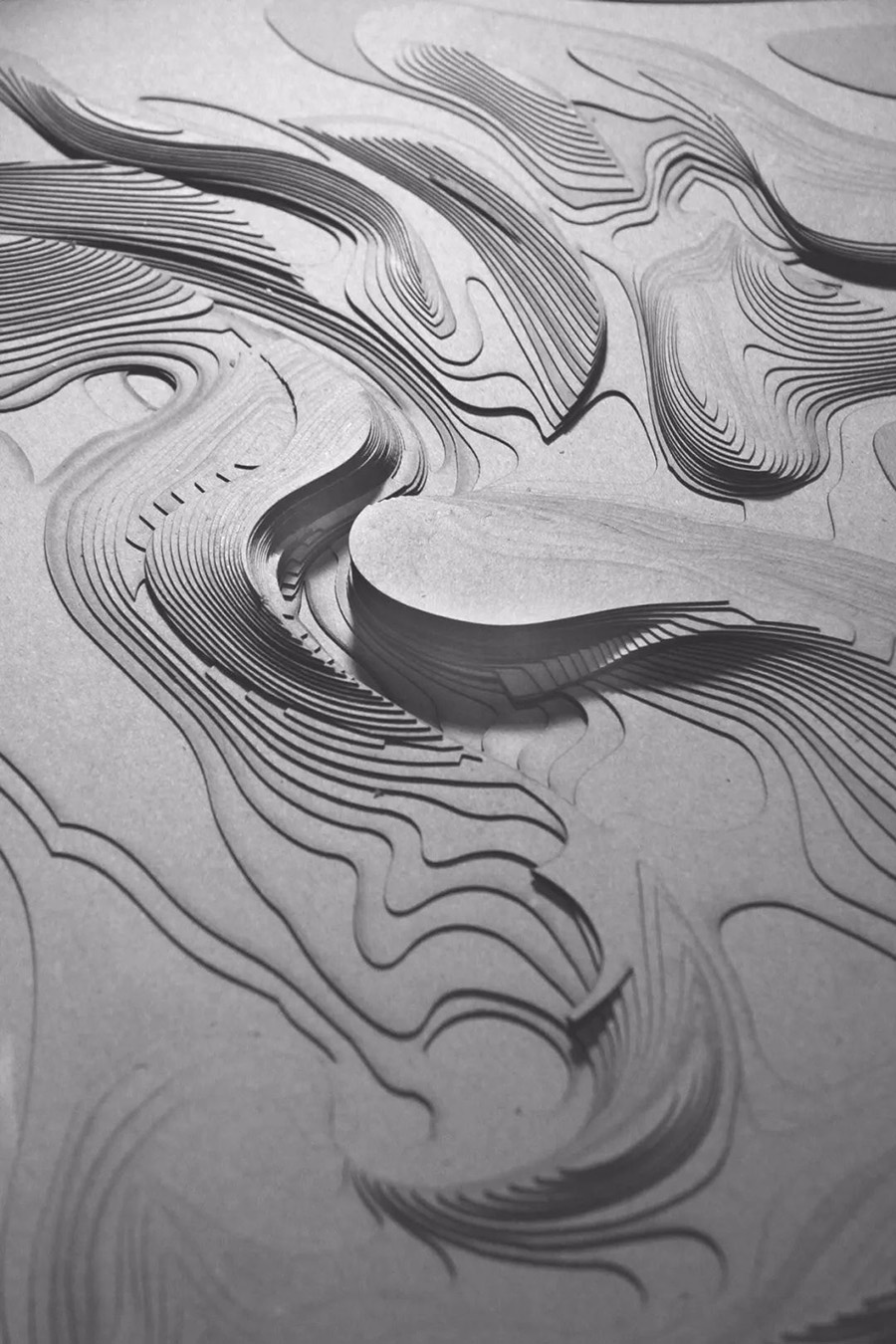 「水盡林中,便得一山,山有一口,如有光一般?!褂伤山嫌雾樍鞫拢瑏?lái)到一片豁然開朗的世外桃源,整個(gè)空間充滿了尺度與魔幻,幾個(gè)格子金屬屏風(fēng)高高聳立,猶如松江里的萬(wàn)畝良田,一派富饒的景象油然而生。身旁竟有兩個(gè)神秘的洞口,稍作停留,便迫不及待地探索里面的神秘世界啦!