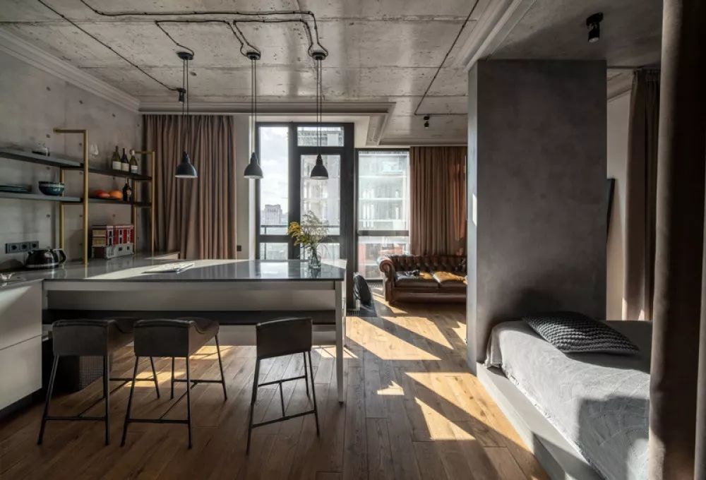 設(shè)計(jì)團(tuán)隊(duì)ZOOI室內(nèi)工作室在這個有限的居住空間——僅42平方米,為一對年輕夫婦創(chuàng)造一個時尚,實(shí)用和寬敞的小家。設(shè)計(jì)師使用了一些爵士風(fēng)格的元素(皮沙發(fā)和酒吧凳子,黃銅和銅的元素,黑暗的色調(diào)和粗糙的材料),結(jié)合動態(tài)的城市風(fēng)格(暴露的管道和電線,裸露的混凝土結(jié)構(gòu)和直接的形狀和角度),實(shí)現(xiàn)了意想不到的時尚氛圍。