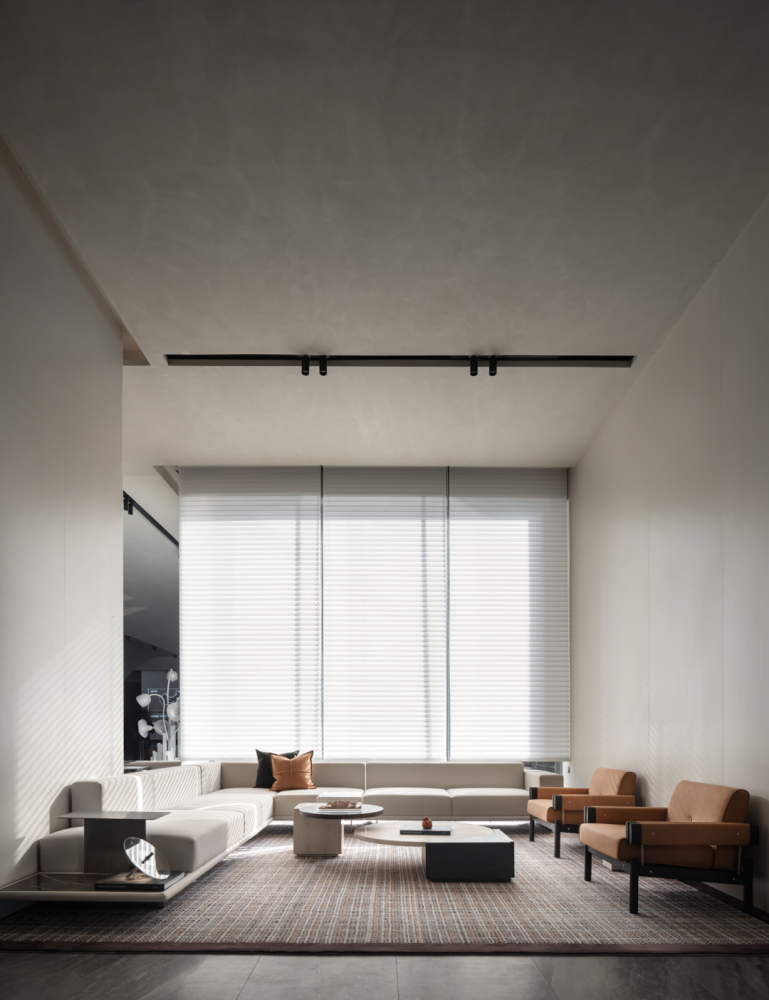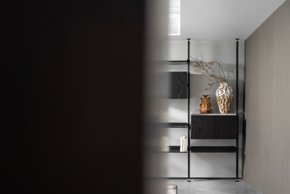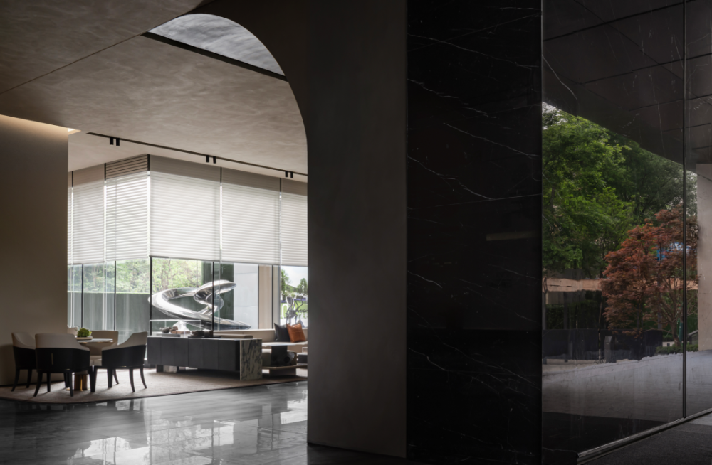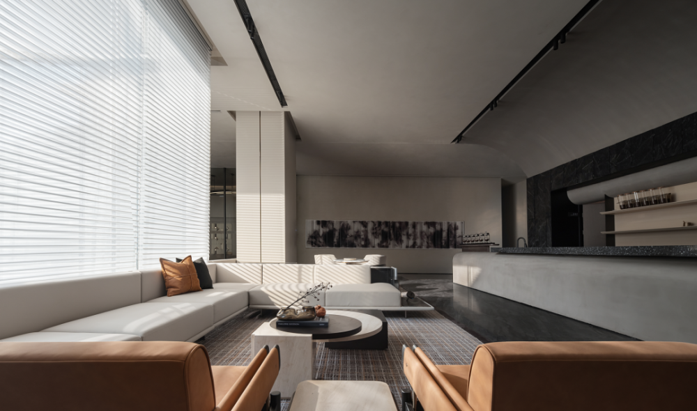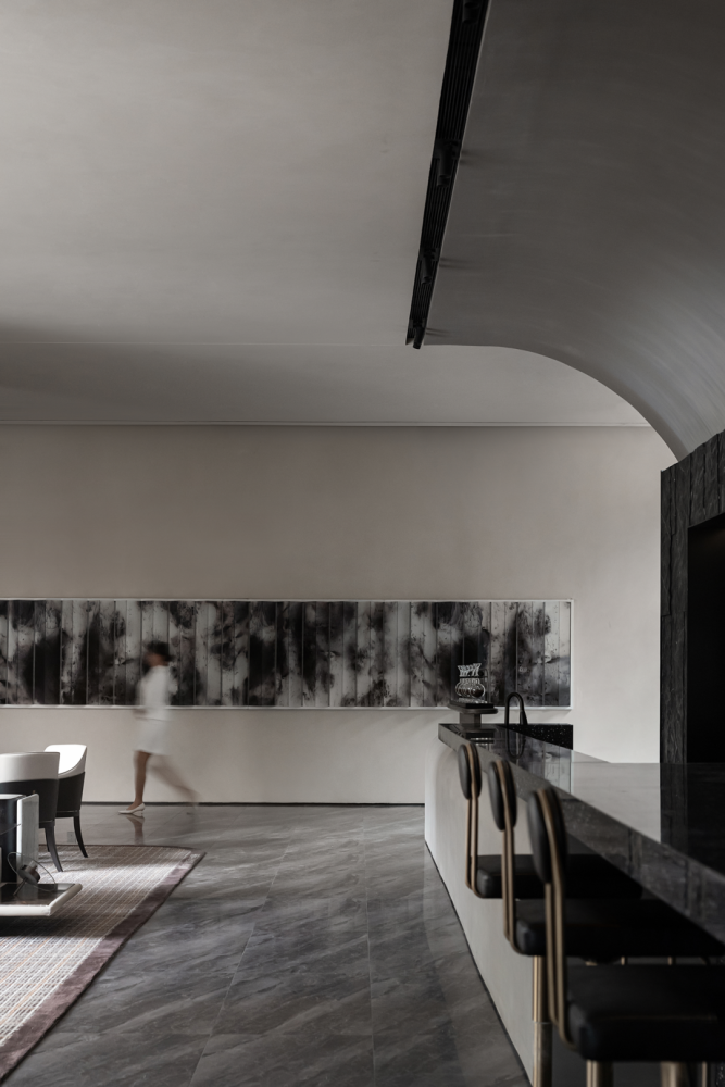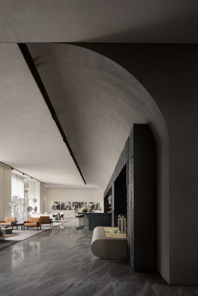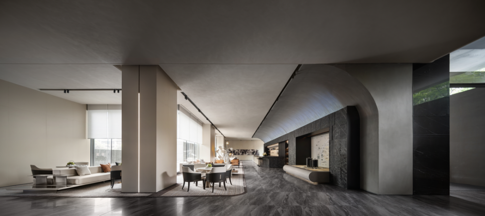 從灰色的前廳進(jìn)入,整個(gè)空間平面疏朗平緩,區(qū)域的形成并不依賴確定性的邊界,更多是由空間的場景感所引導(dǎo)。