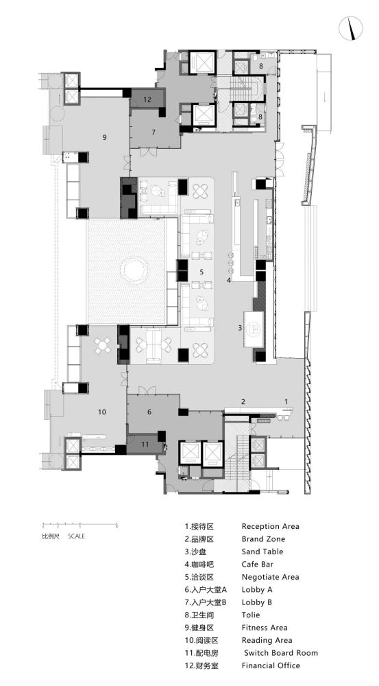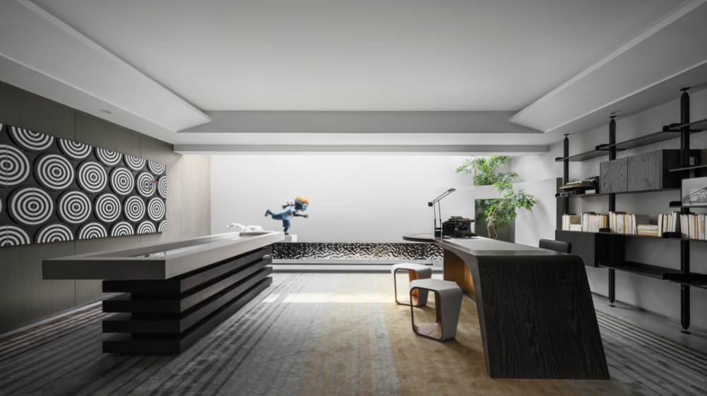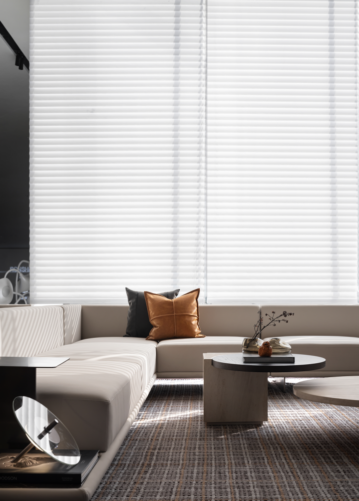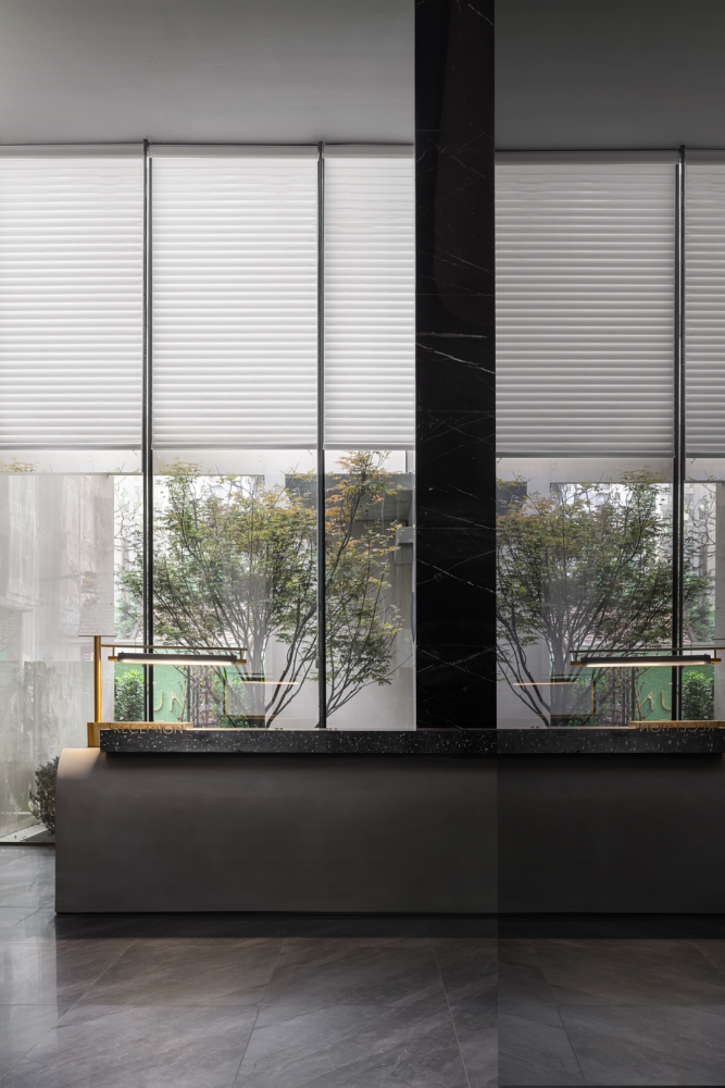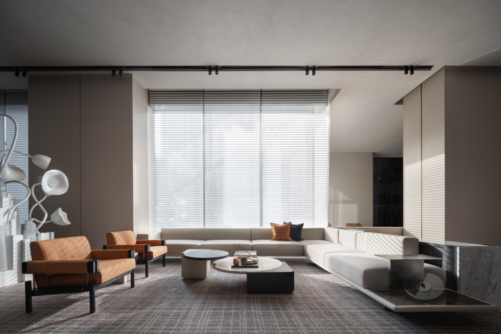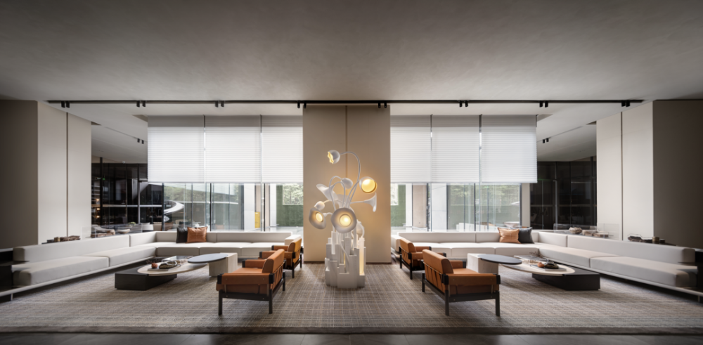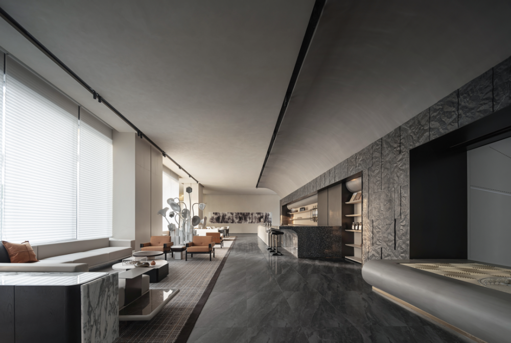 從灰色的前廳進(jìn)入,整個(gè)空間平面疏朗平緩,區(qū)域的形成并不依賴確定性的邊界,更多是由空間的場景感所引導(dǎo)。