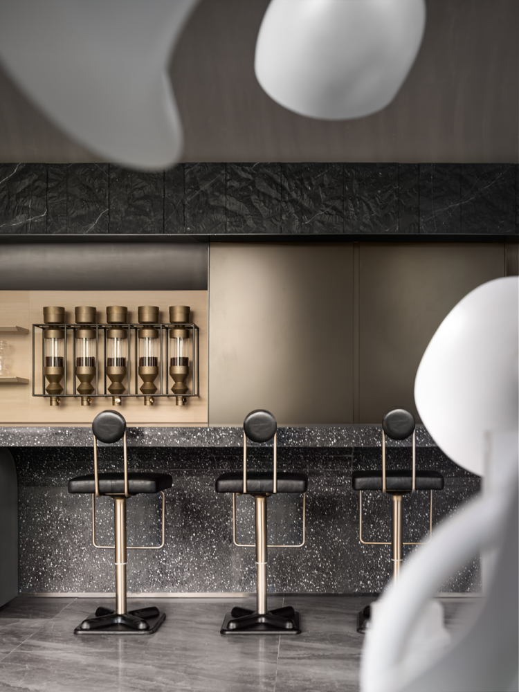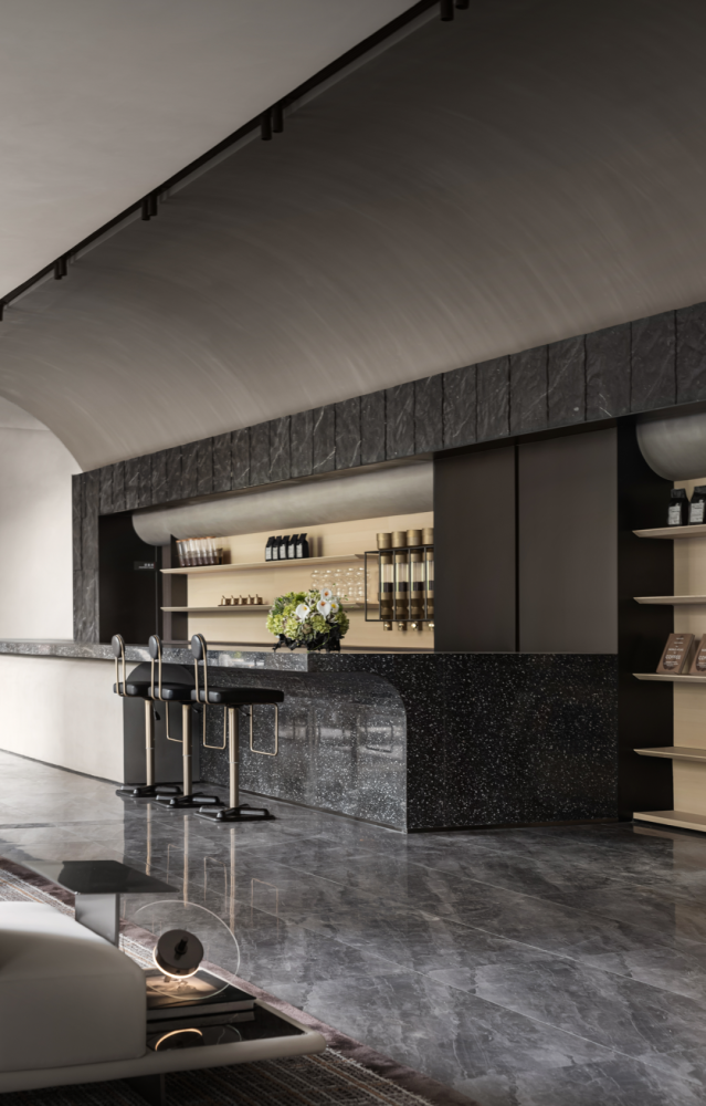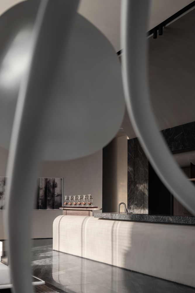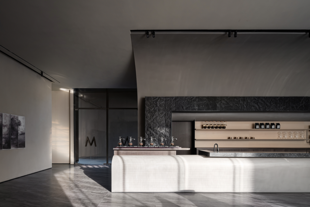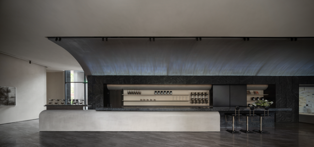 沙盤區(qū)域咖啡吧臺(tái)在前續(xù)的位置上相連,確立著空間動(dòng)線的方向。與此同時(shí),巨大的微水泥弧形曲墻面構(gòu)筑物,將沙盤與咖啡吧臺(tái)微微向內(nèi)包裹,營造出輕松而熙攘的都市街頭氛圍。
