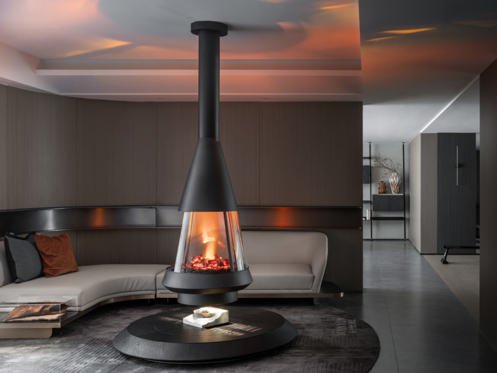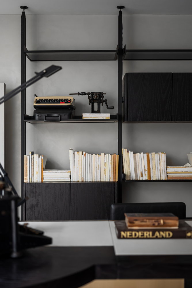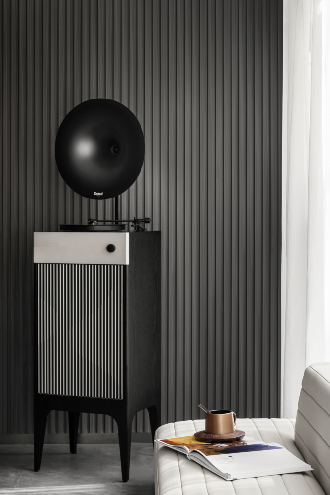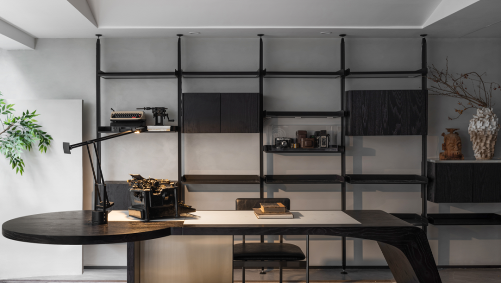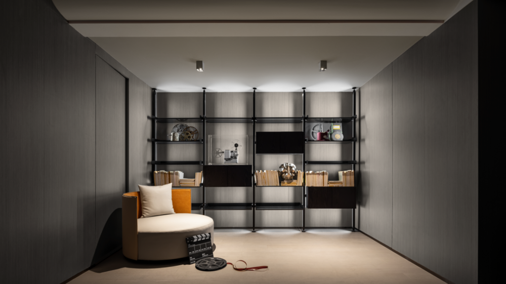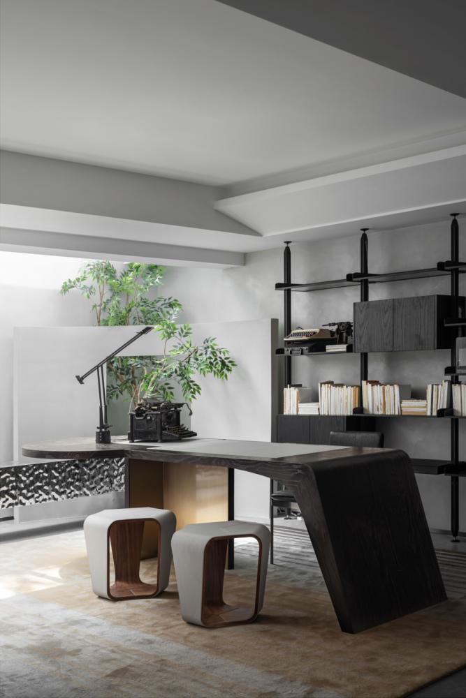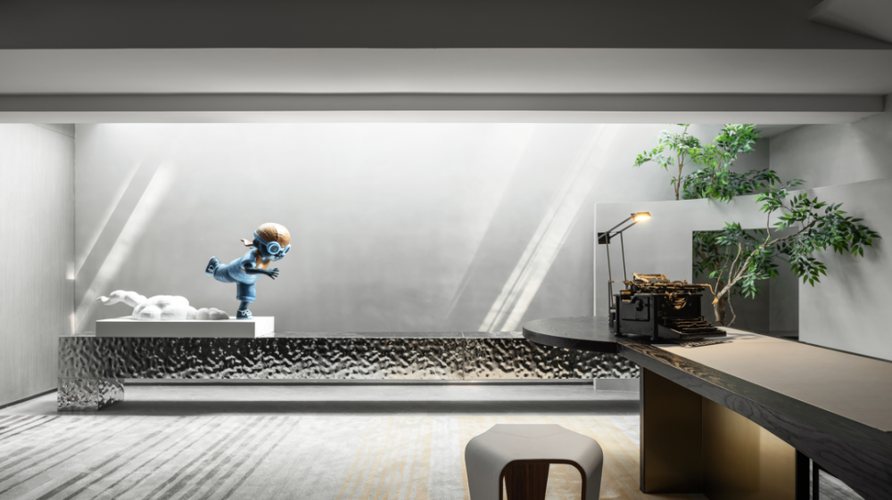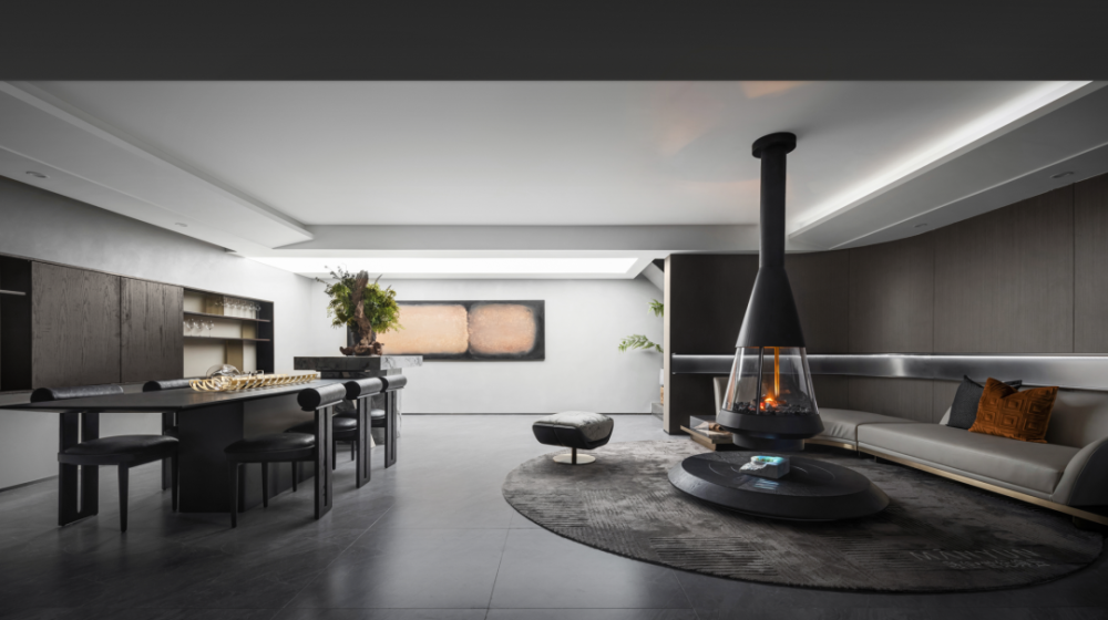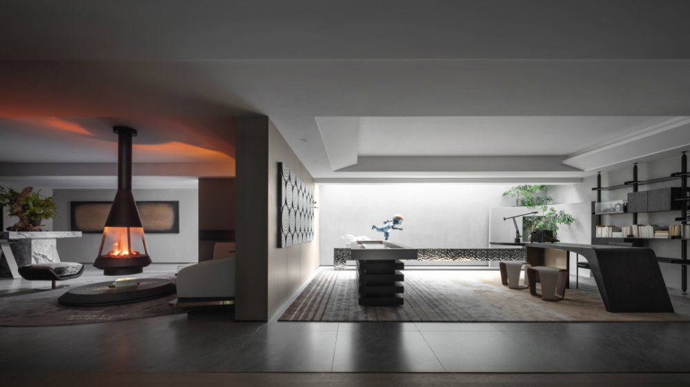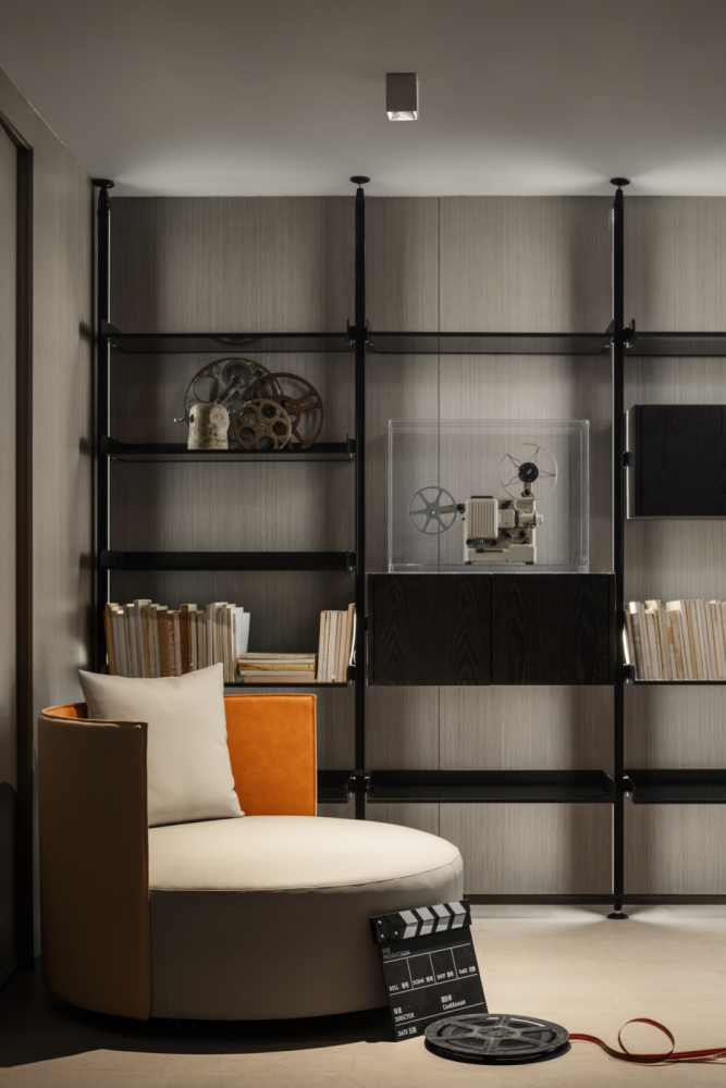在負(fù)一層的公共活動(dòng)區(qū),老式打字機(jī)、電影膠片、老式電影放映機(jī)等眾多老物件,以藝術(shù)收藏的方式進(jìn)入空間細(xì)節(jié);帶有古典意蘊(yùn)的書案和置于中心位置的火塘,則以傳統(tǒng)的形態(tài)參與進(jìn)現(xiàn)代生活。位于空間最內(nèi)側(cè)采光天井,使得陽光洗墻而下,現(xiàn)在時(shí)與過去時(shí)交融,新的感知被某種瞬時(shí)性所激活。