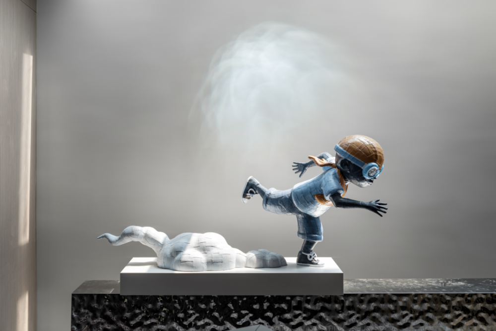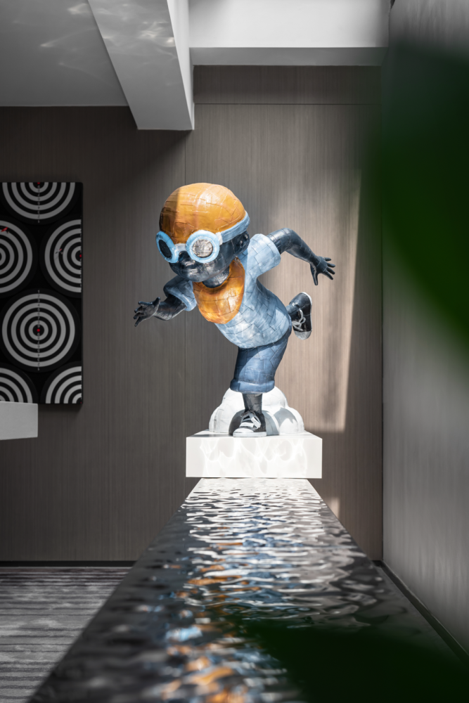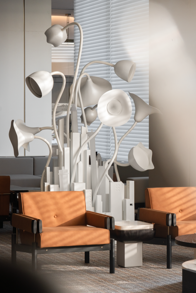 代表融合共生的原創(chuàng)性藝術(shù)裝置,位于兩組沙發(fā)座椅中間。以成都老城區(qū)建筑形態(tài)為底座,以蔓延向上生長的花朵為生命形態(tài),暗示著城市新舊文化共生、人文與自然共處的美好憧憬。