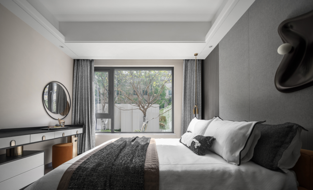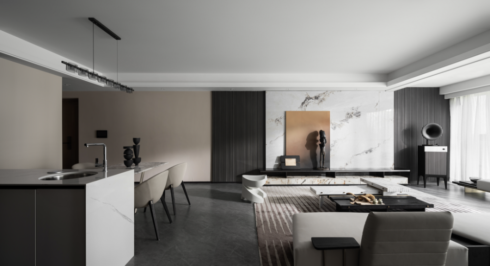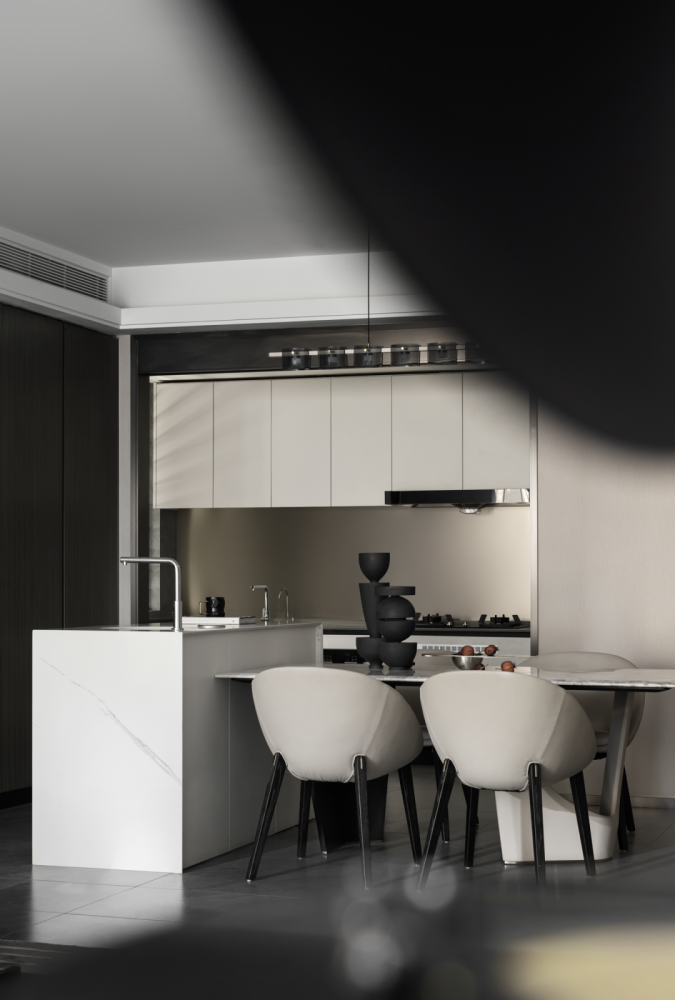 精裝修交付標(biāo)準(zhǔn)樣板間內(nèi),以中島臺(tái)為過渡的開放式客餐廳,從視覺上擴(kuò)展了空間的通透性;客廳外側(cè),戶外陽臺(tái)的內(nèi)化處理,提升空間利用率的同時(shí),更進(jìn)一步加深了內(nèi)部空間自由延伸狀態(tài)。
